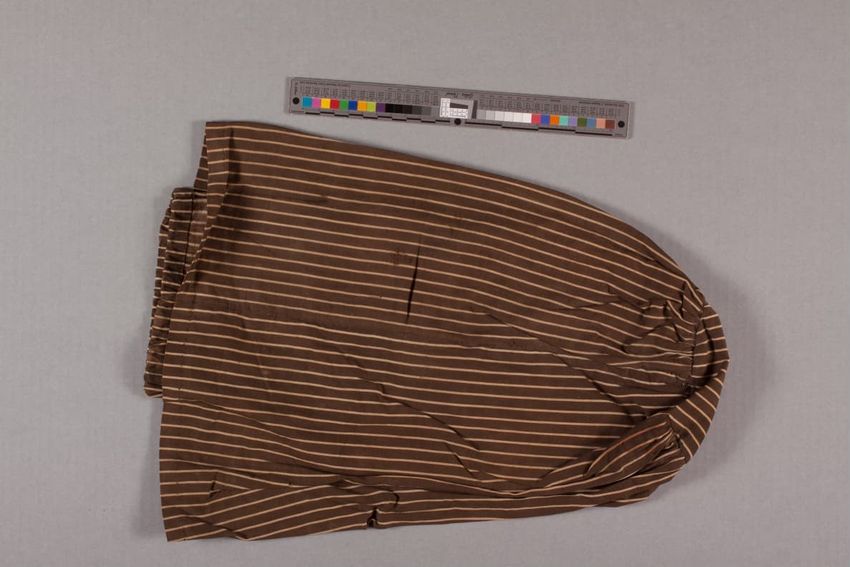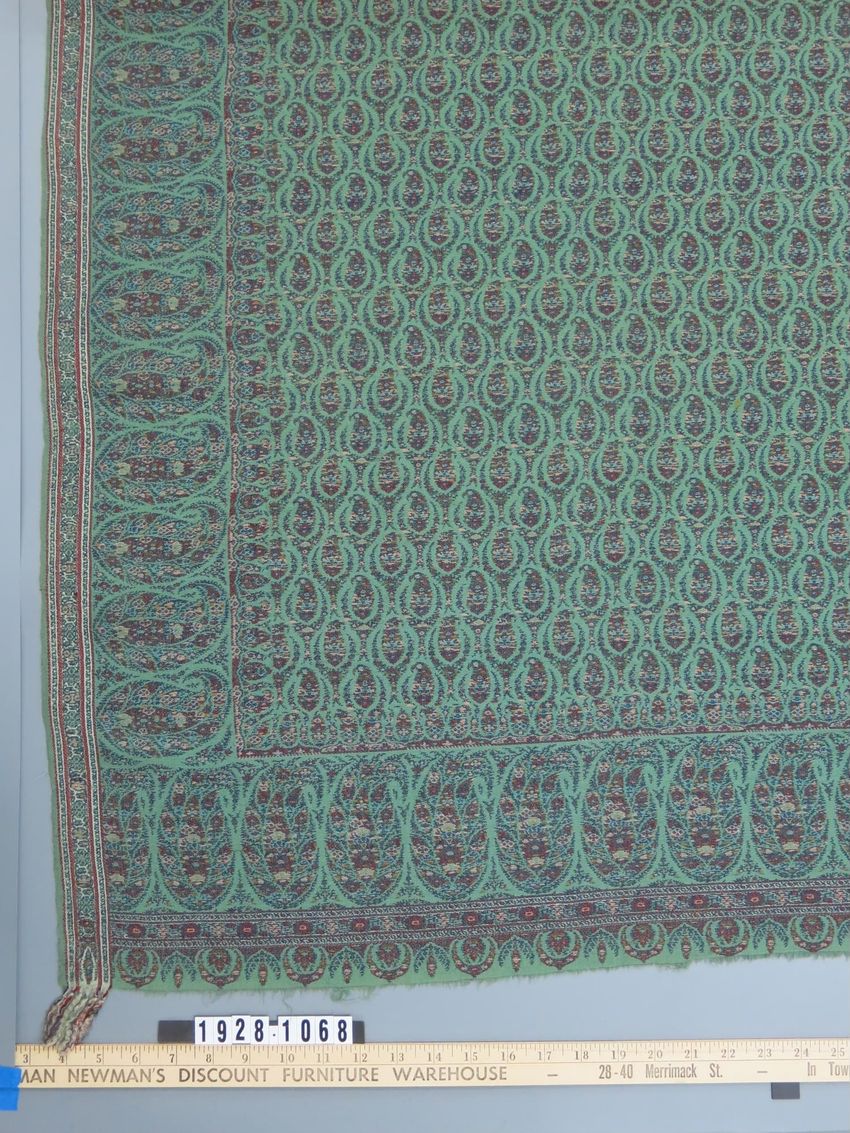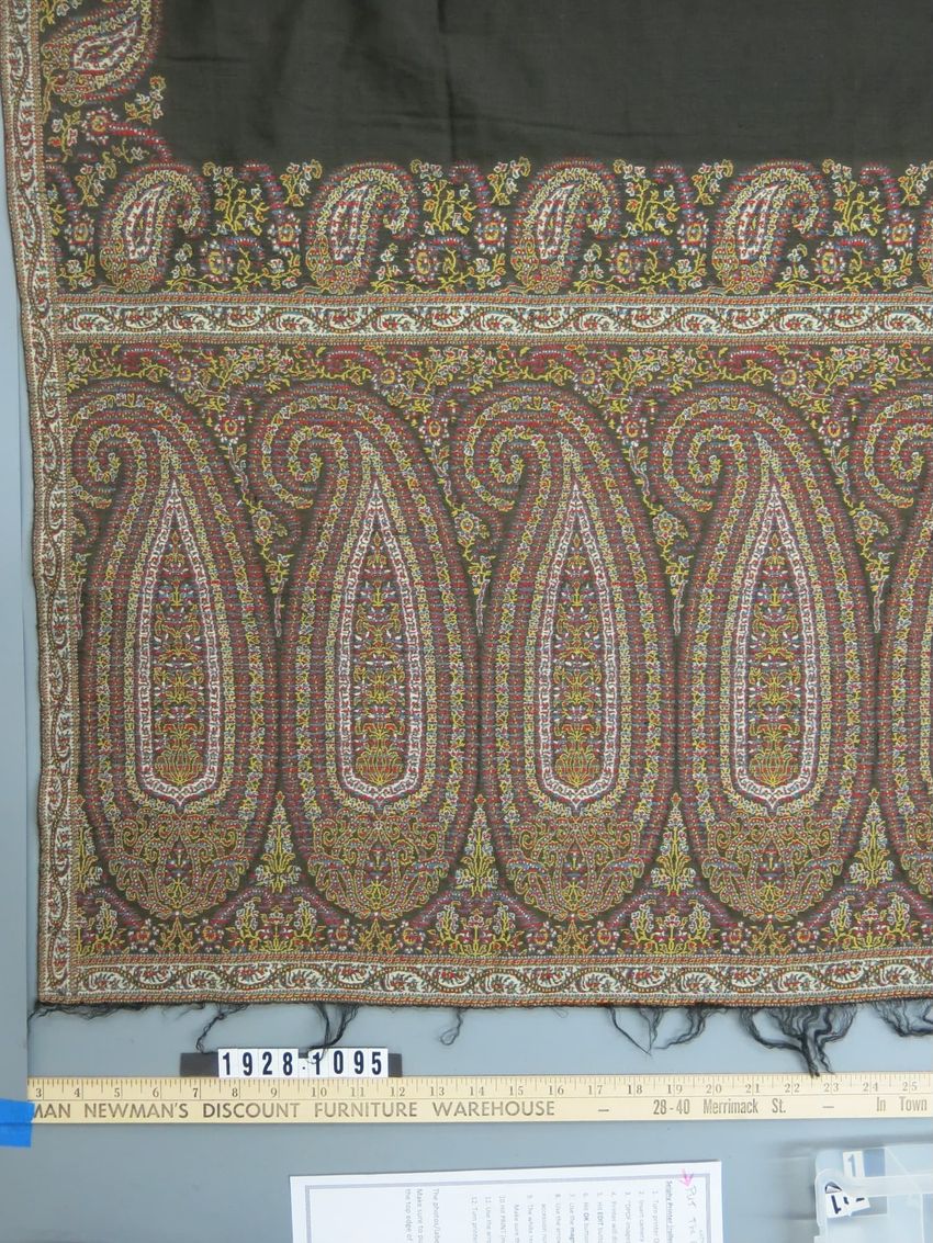 Black center, ends of brown, yellow, red, white; 18" border of repeated paisleys with   3 1/2" inner border of tilted botchs on all four sides; quadruple pattern wefts of red, brown, blue; possibly wool warp, cotton weft.