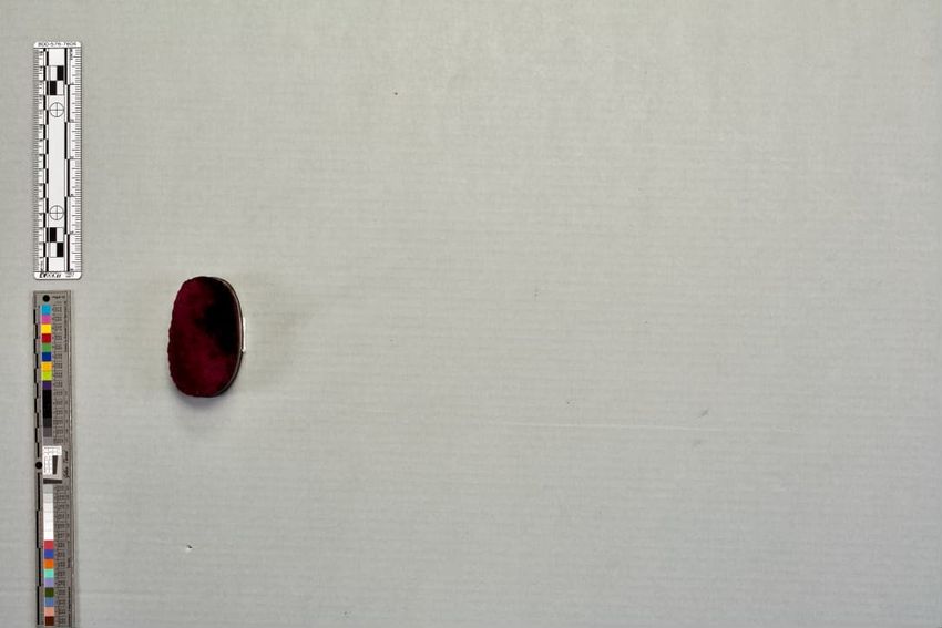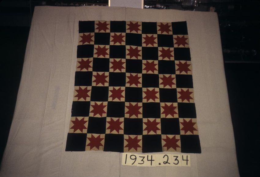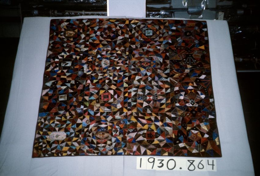 Burgundy linen(?) canvas cross-stitched, floral (?) design in center. Cross-stitched with wool (?) yarn (light green, dark green, blue, dark red, light brown, light gold, light red). Blanket stitched at edges. Fringed. Floral design is possibly representing letter "B" or "F."