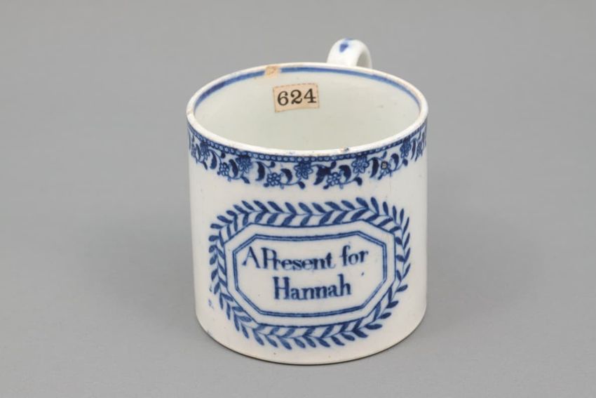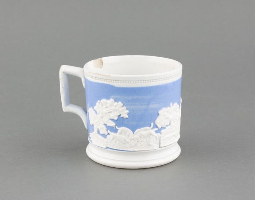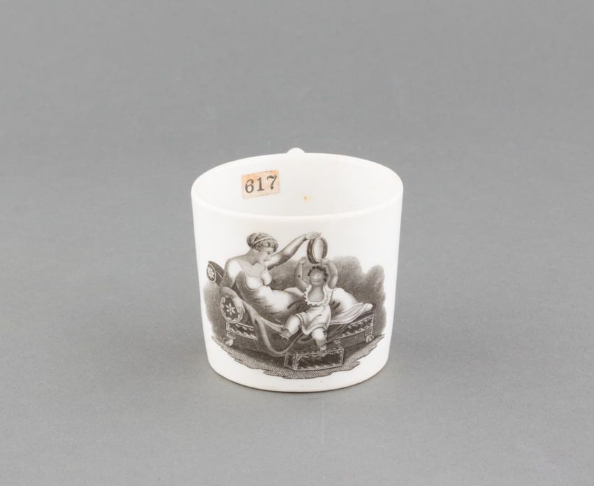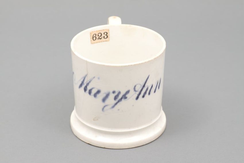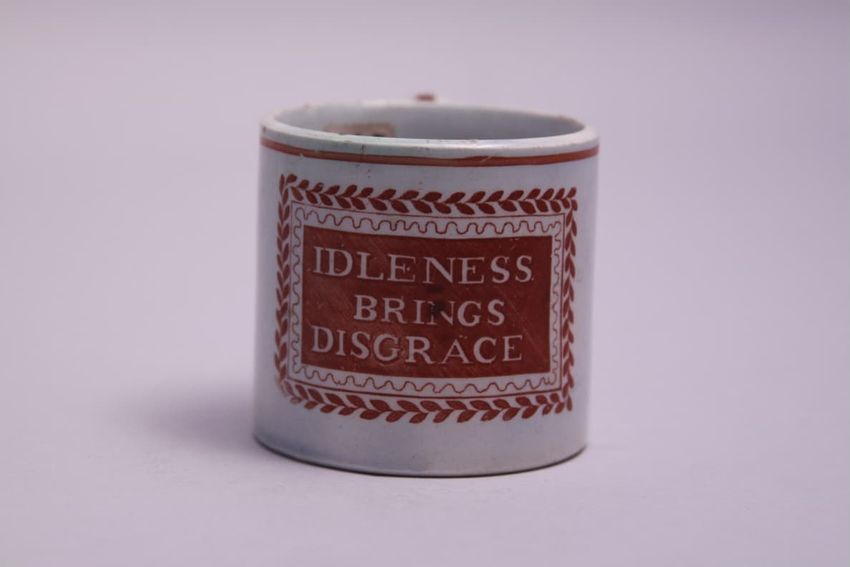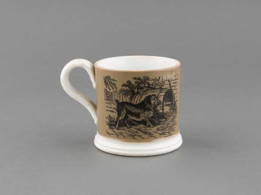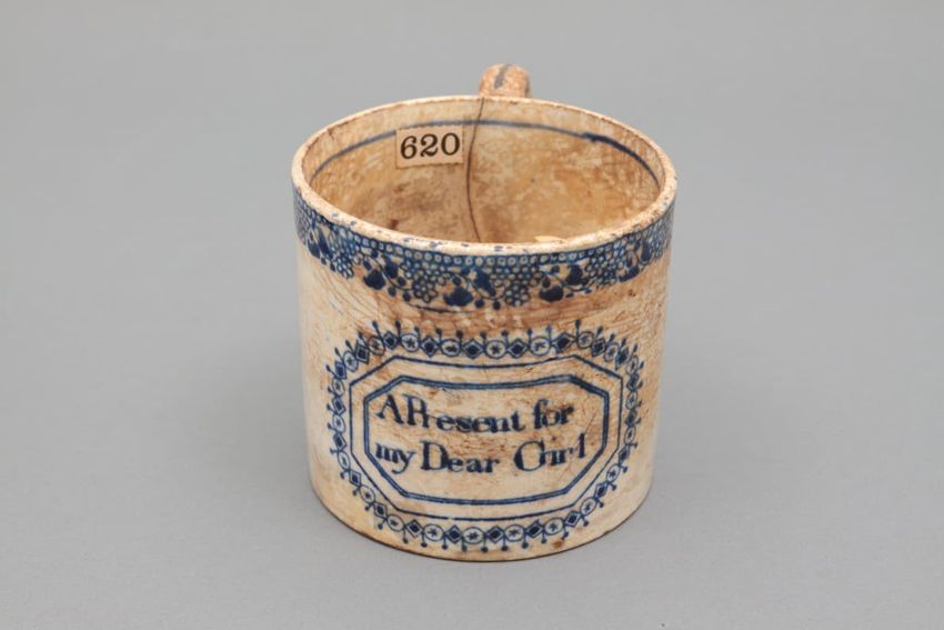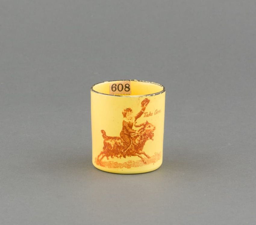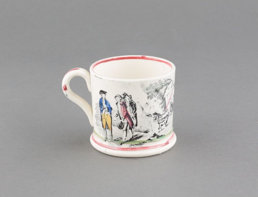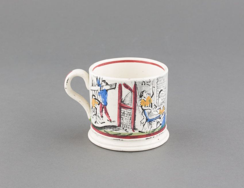Lusterware mug. Concave body, shaped and beaded base, beaded rim, and spurred loop handle. Copper luster with yellow band around middle and applied floral decorations, overpainted with green, yellow, blue, red, and pink. Interior of mug coated in luster.