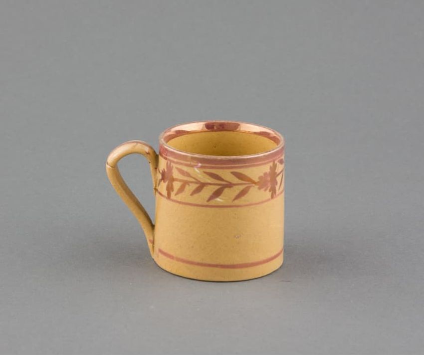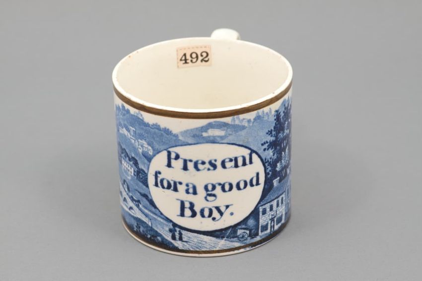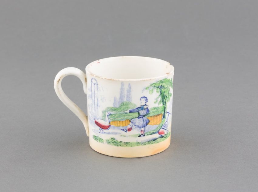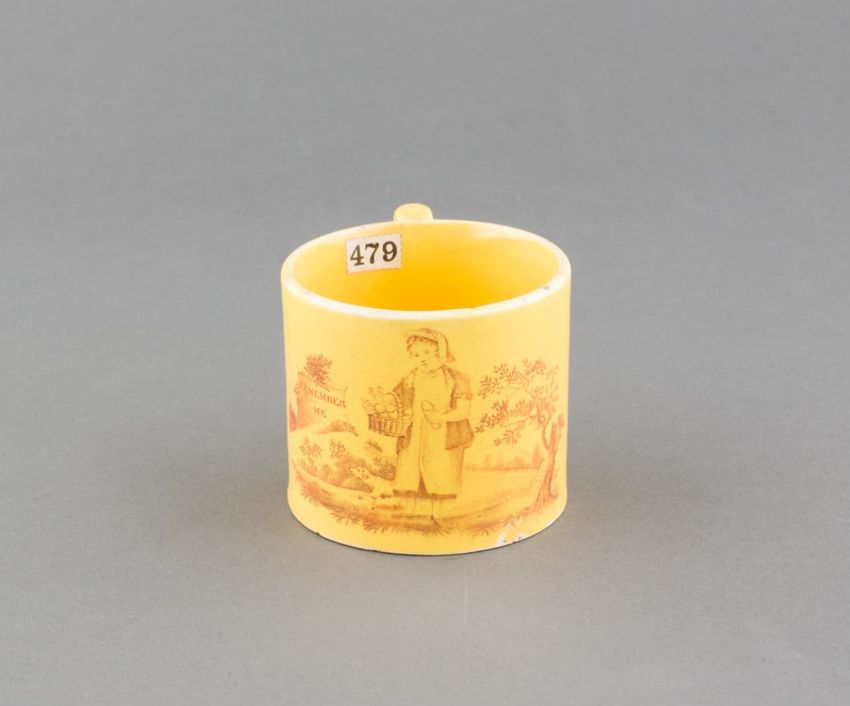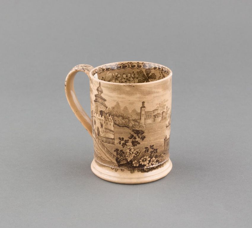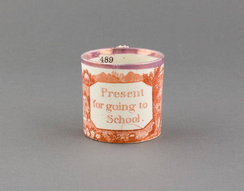 Creamware children's mug. Rust-colored red transfer-printed design, landscape scene, surrounding an octagon with the words "Present for going to School." On the right, two men hold fishing poles; on the left, a man on a horse is in front of a cottage. A gazebo with a dome roof is in the distance ...