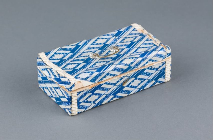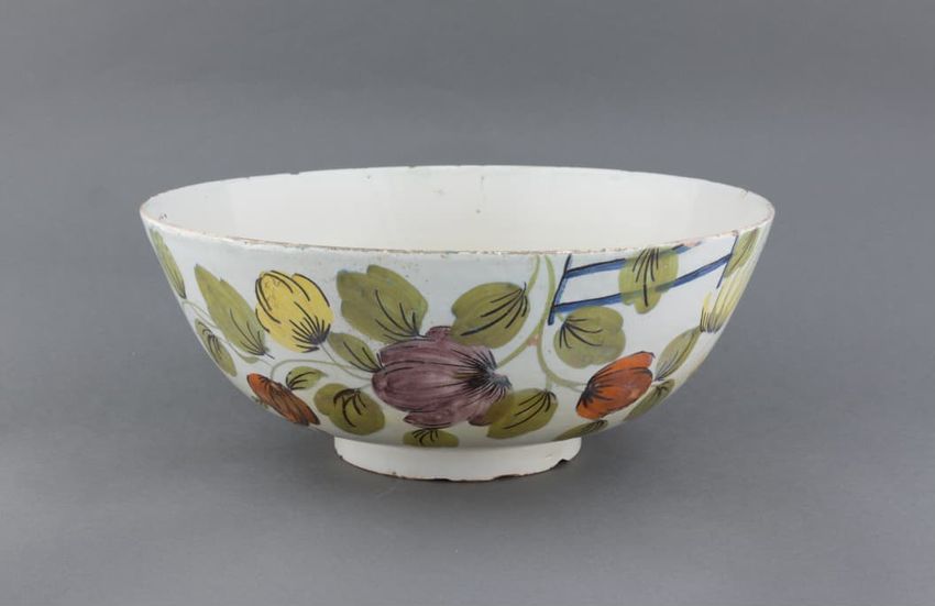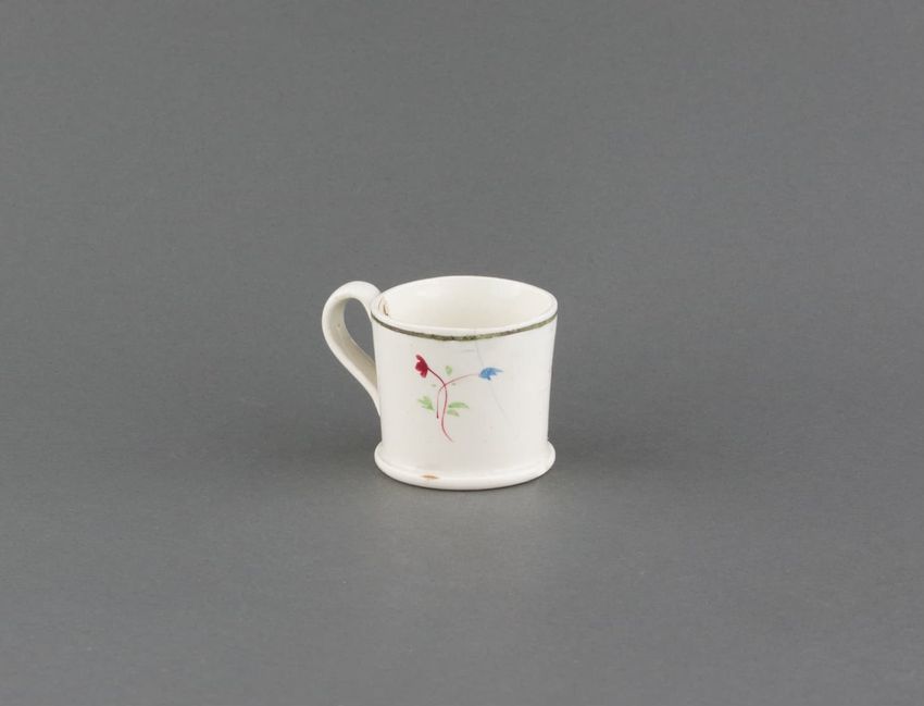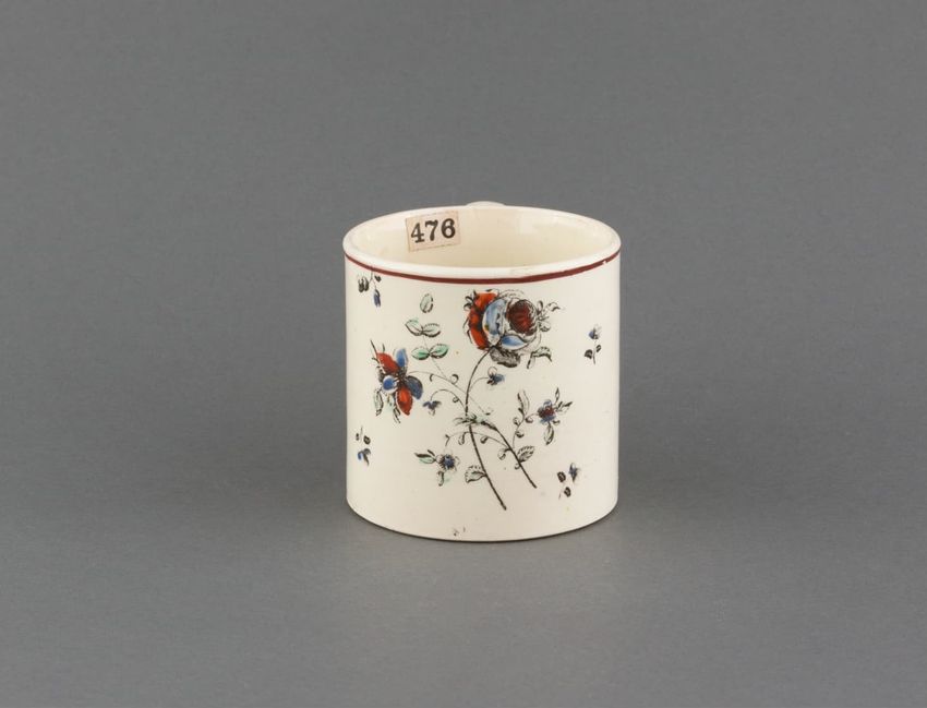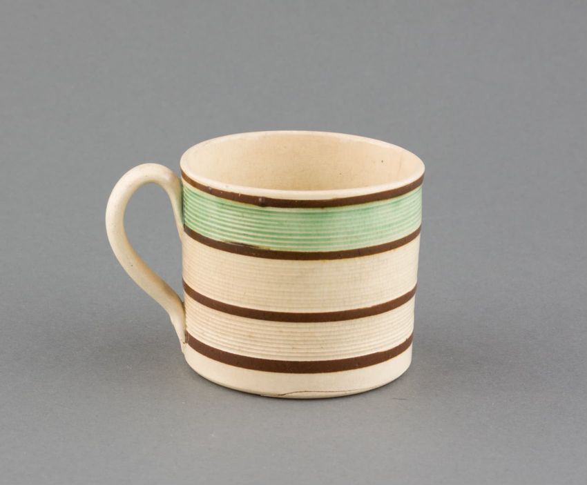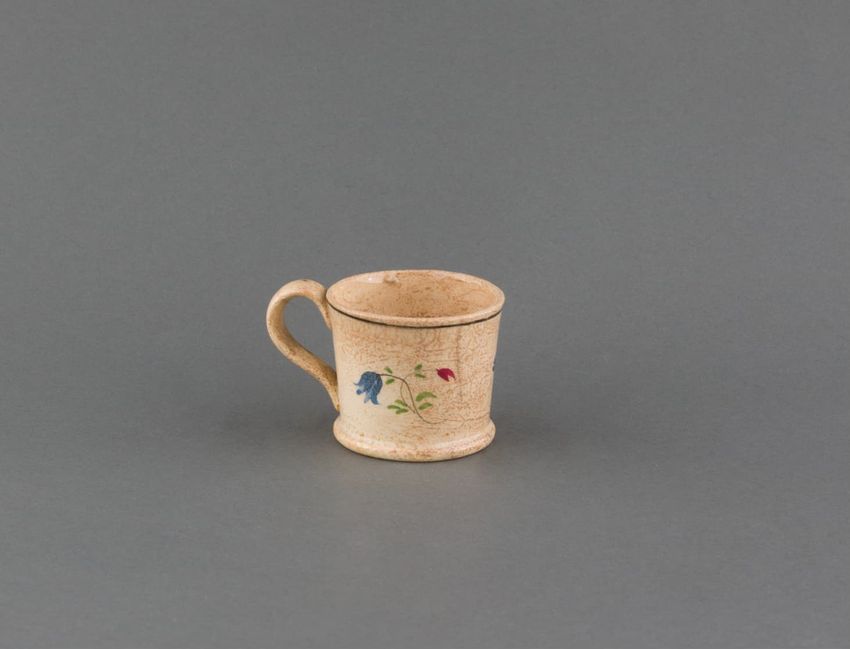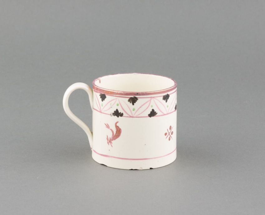 Creamware children's mug. Rust-colored red transfer-printed design, landscape scene, surrounding an octagon with the words "Present for going to School." On the right, two men hold fishing poles; on the left, a man on a horse is in front of a cottage. A gazebo with a dome roof is in the distance ...
