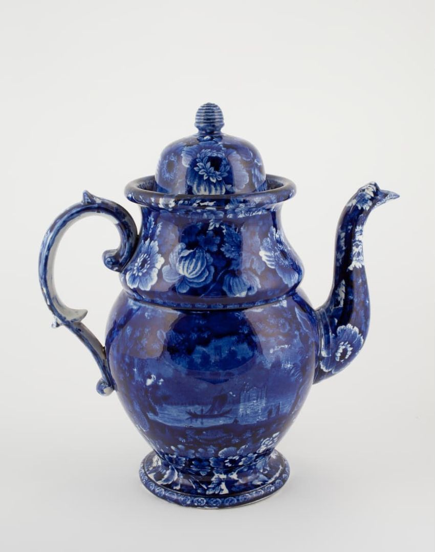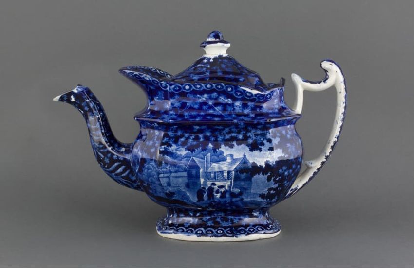 Blue transfer printed earthenware teapot. Floral motif surrounds the rim and cover. Landscape scene featuring pagodas, bridges, and willow trees adorns the body. Superimposed gold gilding in a Greek key pattern surrounds the body and cover. Gold gilding accents finial, handle, and spout.