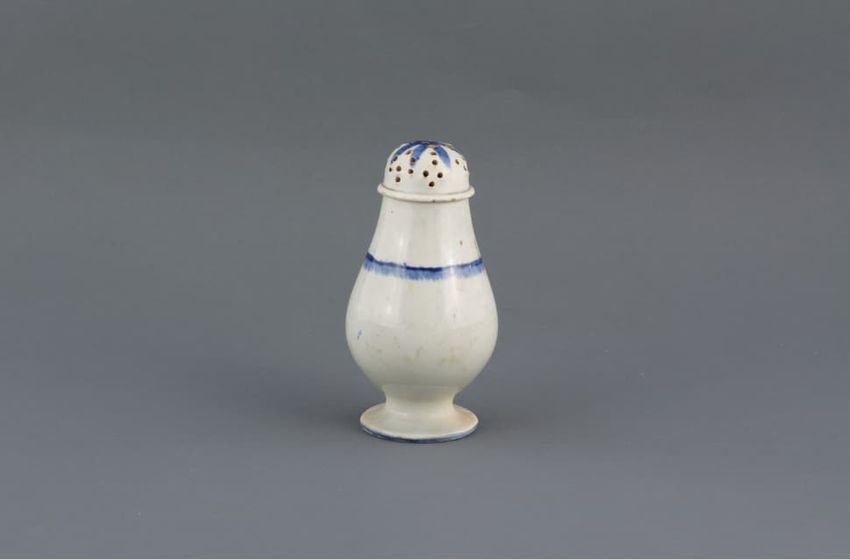 Pear-shaped, pearlware caster with dome-shaped, perforated top. A blue floret is hand-painted on top and a blue band on the foot. The mid-section is encircled with an incised band and ribbing. The incising is hand-painted with a blue feather edge. The stopper is missing.
