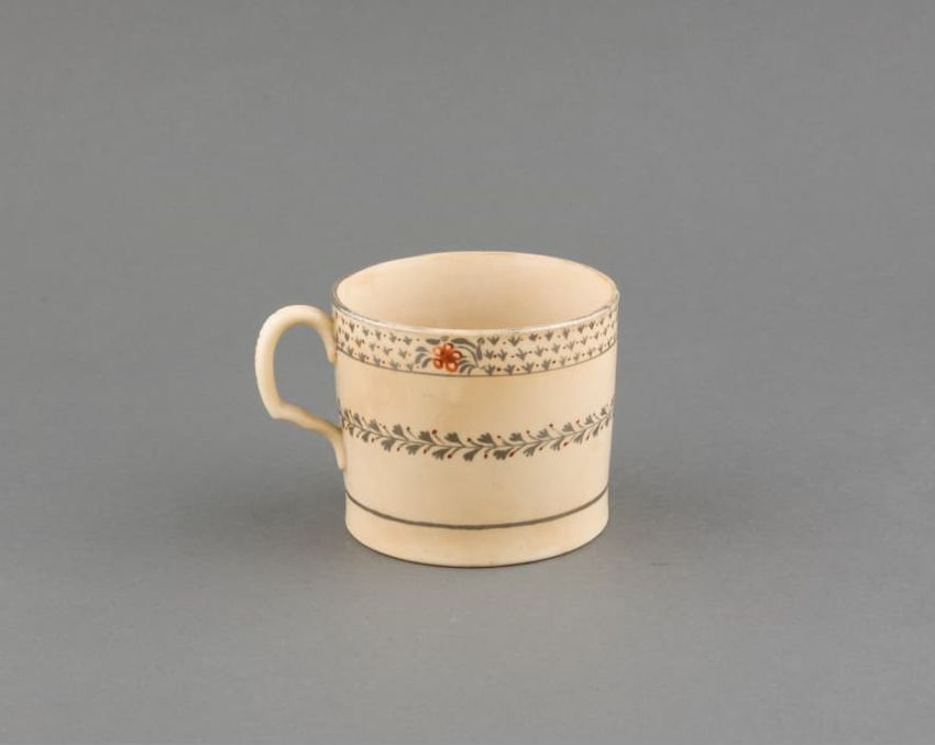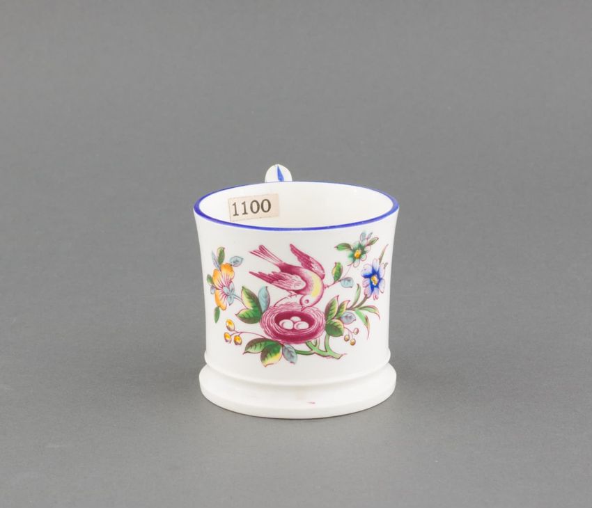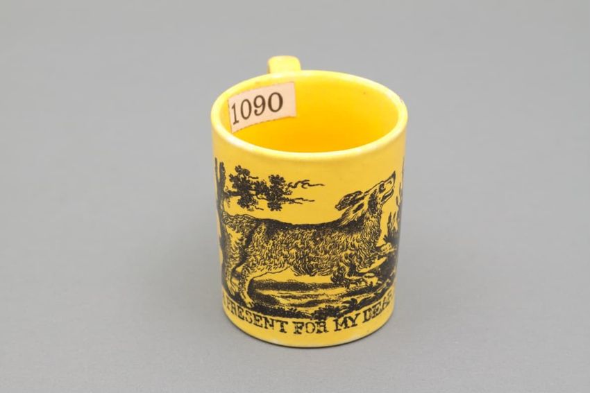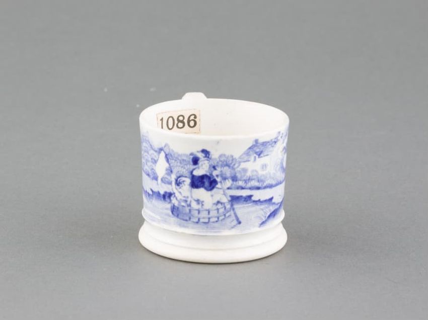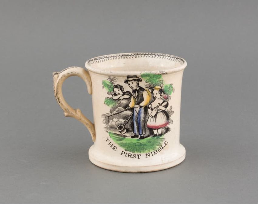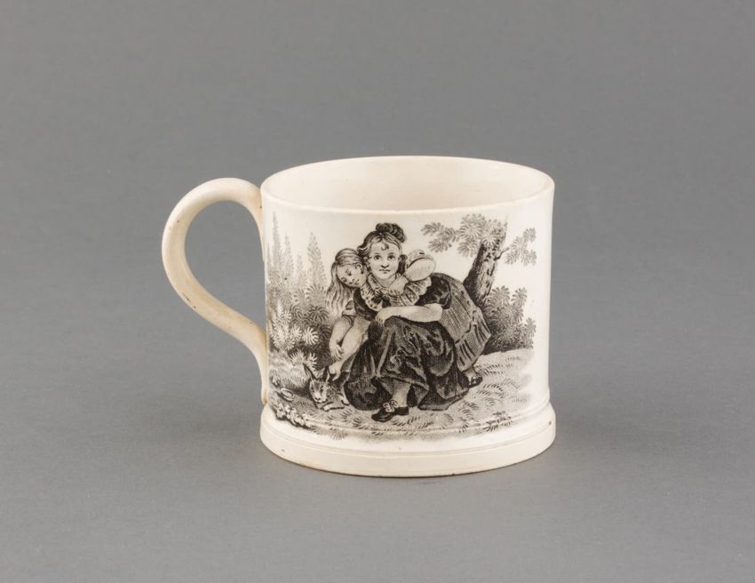 Earthenware children's mug. Concave body. Black transfer printed image, repeated on both sides, "The First Nibble" with three children fishing. Over painted with green, yellow, red, and blue. Decorative border printed around inside of rim and down handle.
