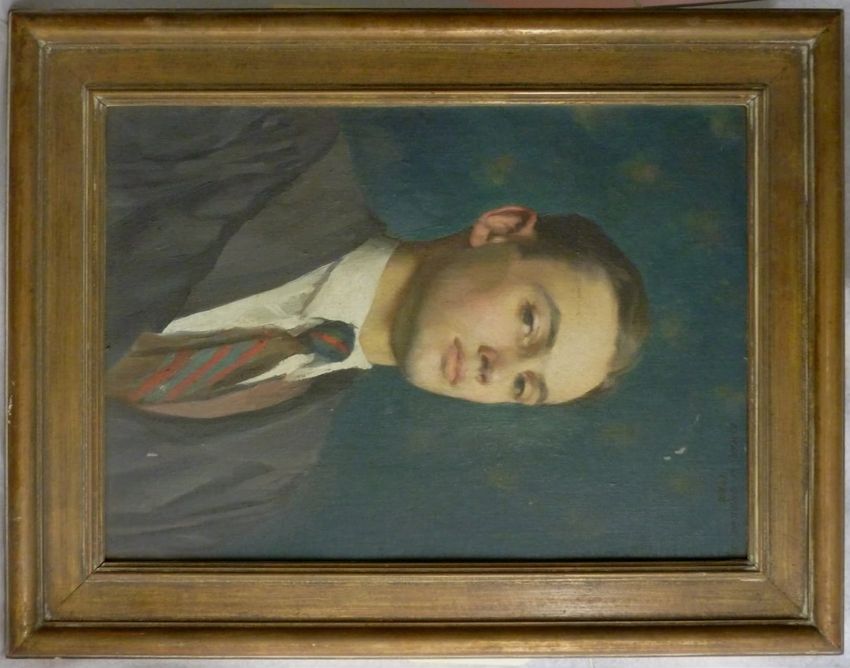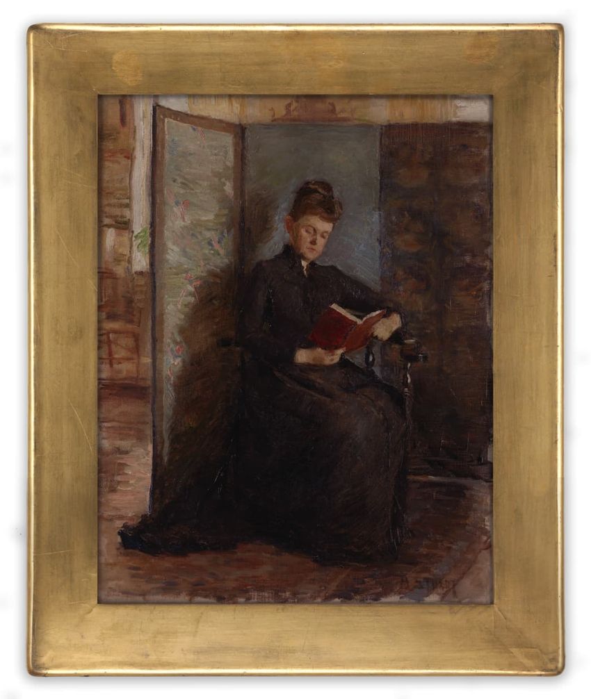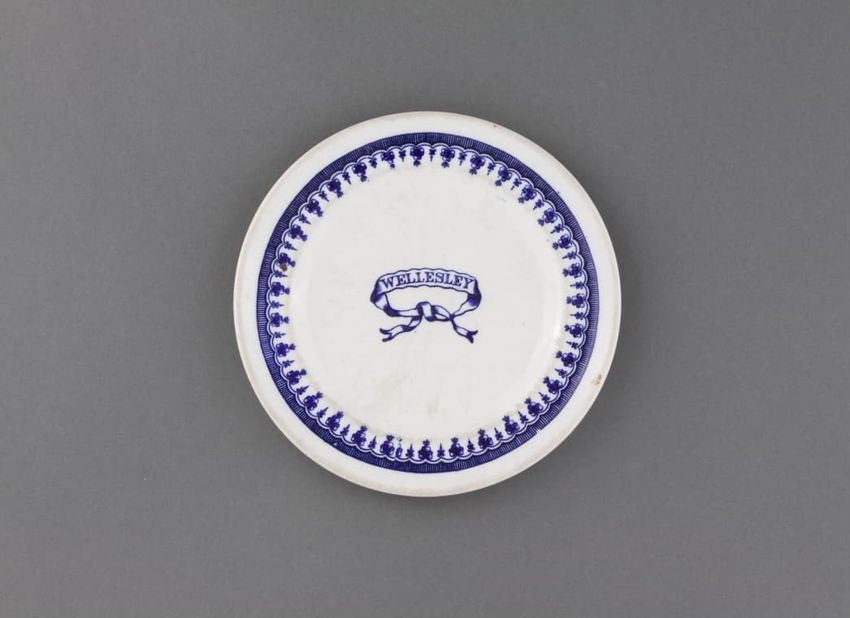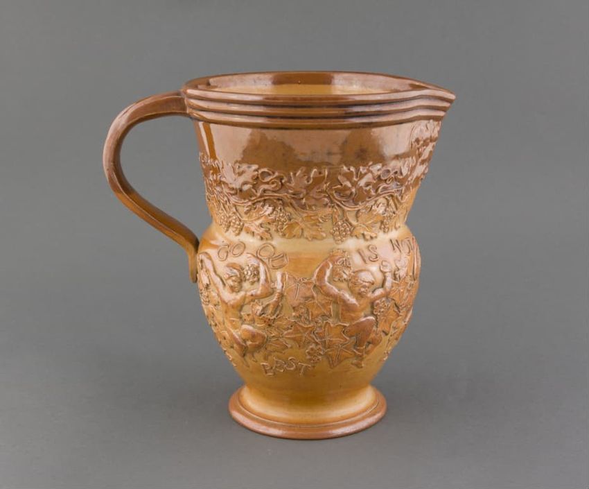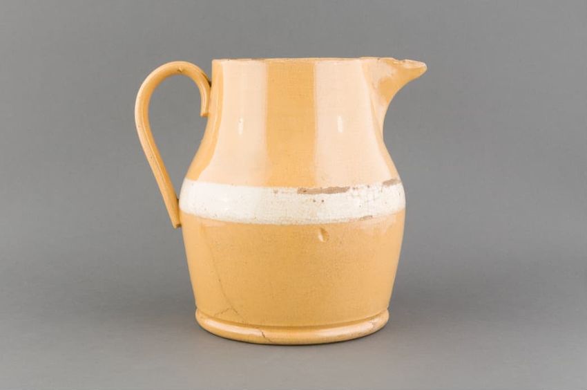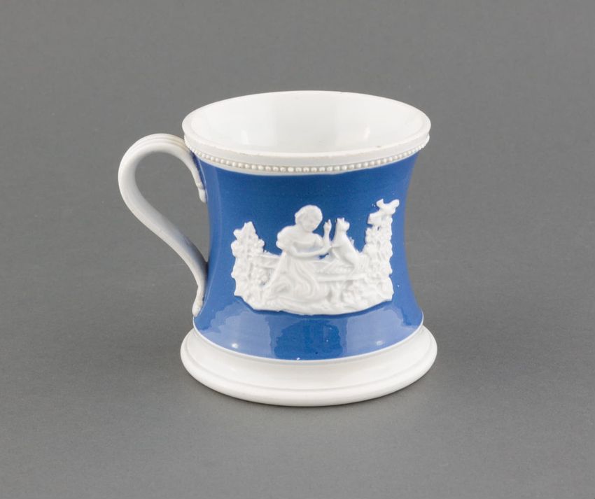 Earthenware children's mug. Concave body. Black transfer printed image, repeated on both sides, "The First Nibble" with three children fishing. Over painted with green, yellow, red, and blue. Decorative border printed around inside of rim and down handle.