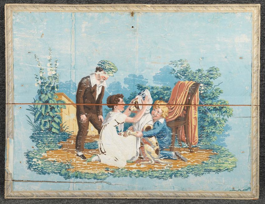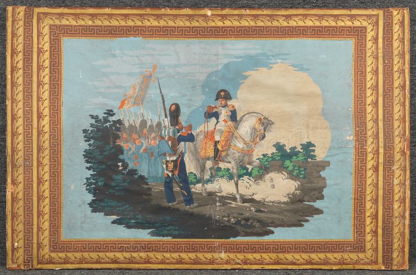 Rectangular straight off-white fustian panel with polychromatic wool embroidery with scrolling blue-green and gold vines eminating from central red chrysanthemum; vine has selection of buds and flowers with few leaves; use of blue-green, gold, green, cream, pink, peach and tans; olive twill wool tap...