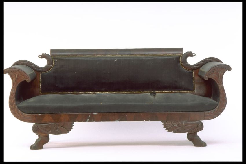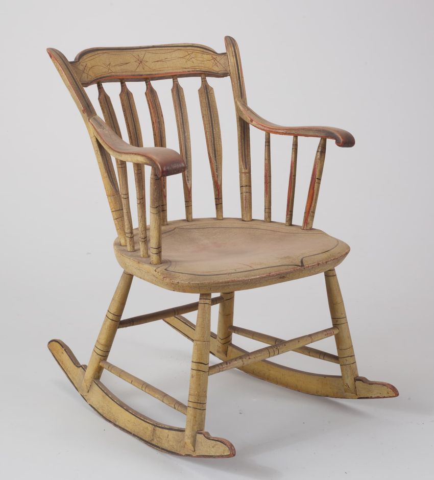 Fancy rocking chair. Maple, pine seat, yellow paint over red paint. Five-arrow back, step-down crest, scroll arms, shaped and scooped seat, tapered legs, long rockers. Painted yellow over red. Pine seat.