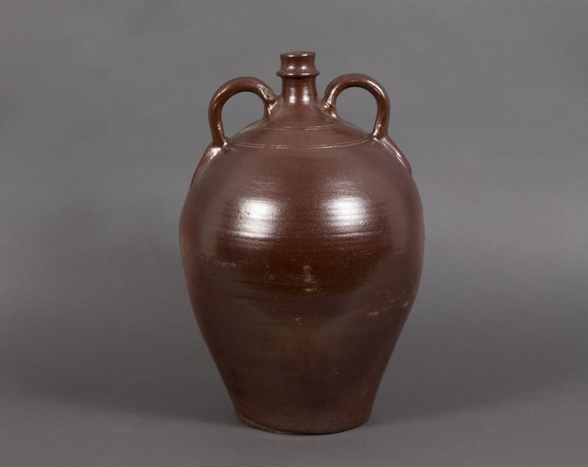 Large stoneware jug with oval body rising from narrow base. Loop handle. Light tan to gray glazed exterior with the following stamped under mouth: "SOLD BY JOSHUA DURGIN & CO, DRUGGISTS, NO 64 MIDDLE STREET, PORTLAND, 3." Stamped letters and number are tinted with blue glaze.