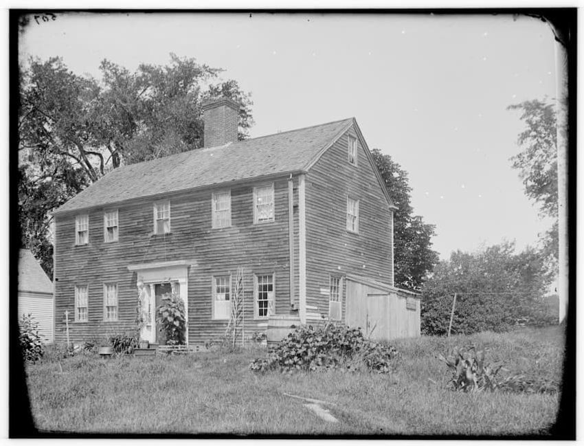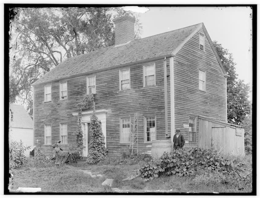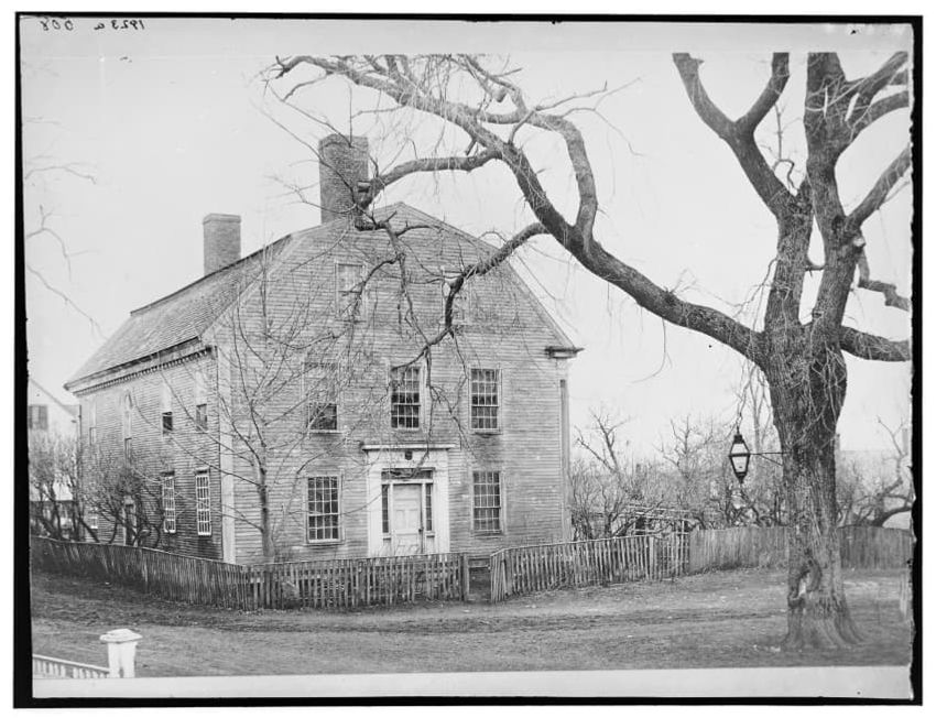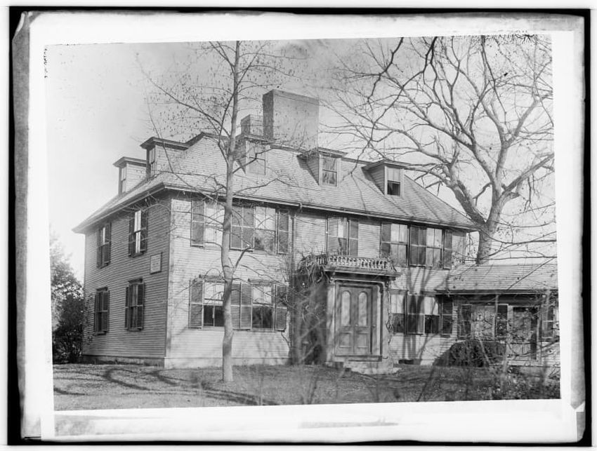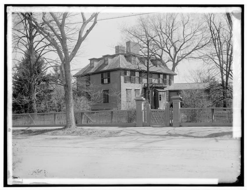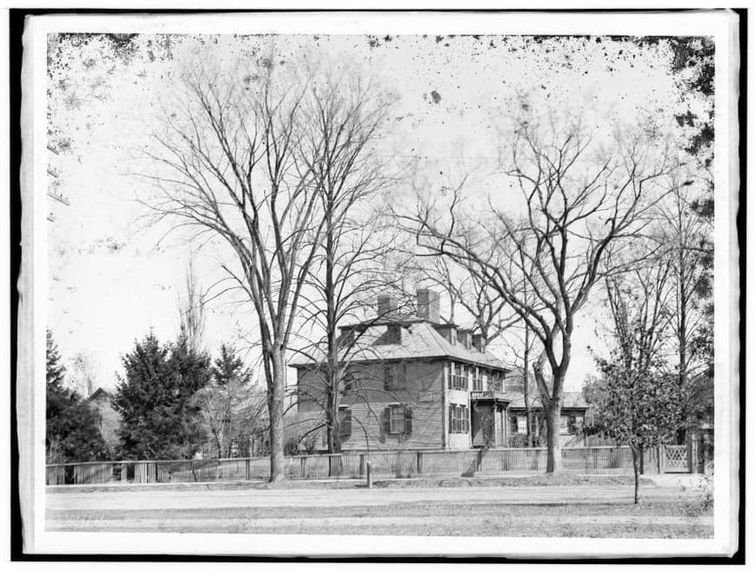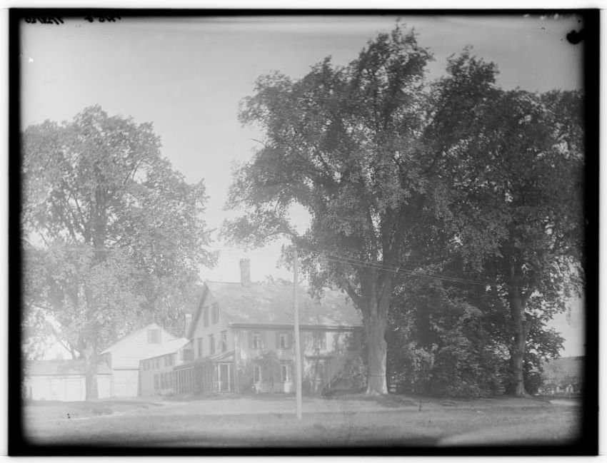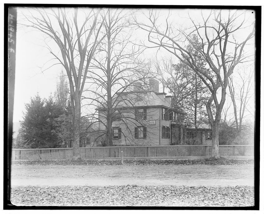 The image depicts Buckman Tavern, a historic building located in Lexington, Massachusetts. It is a large wooden structure with multiple windows, shutters, and dormer windows on the roof. A prominent door is situated at the center, flanked by a small porch. Leafless trees are visible in the foregroun...