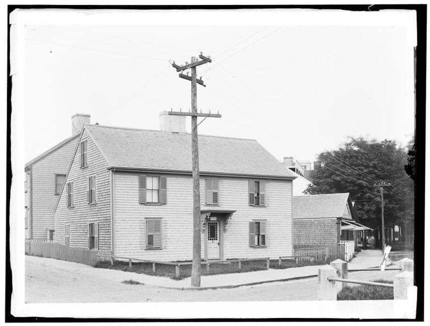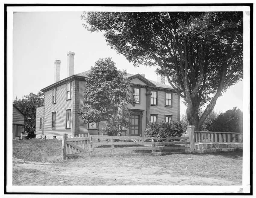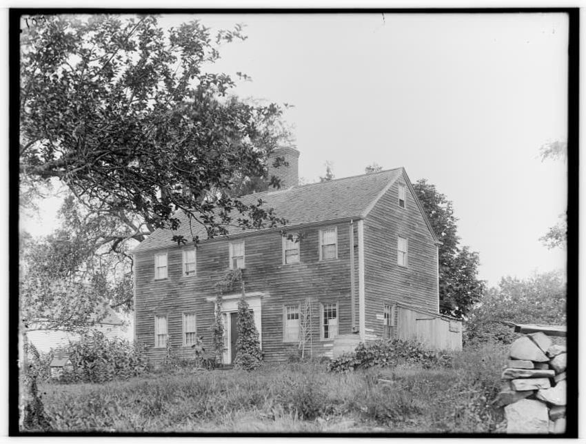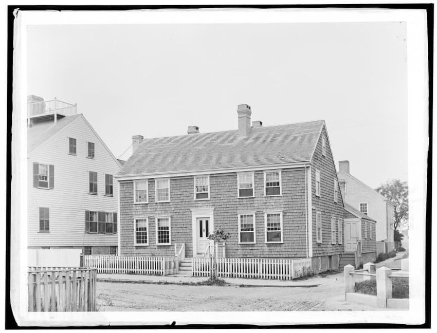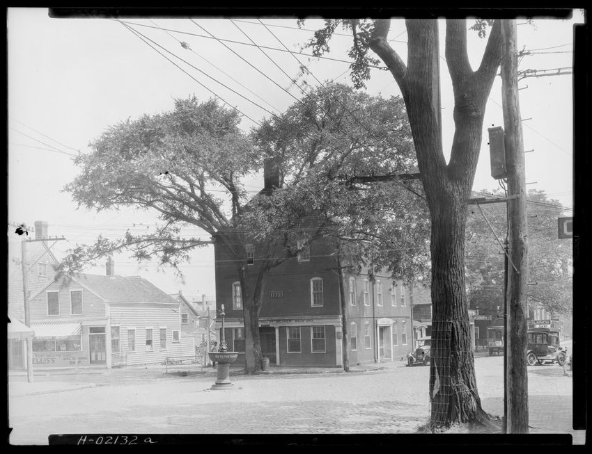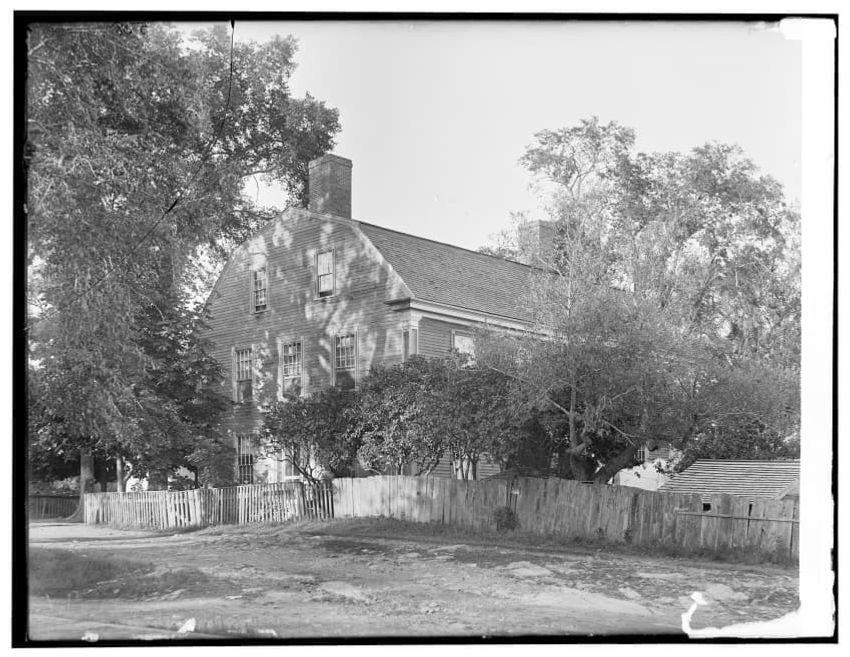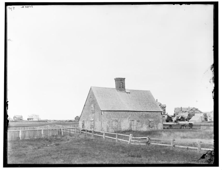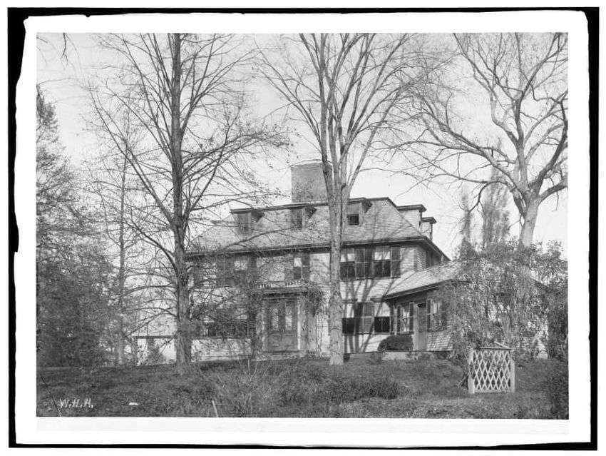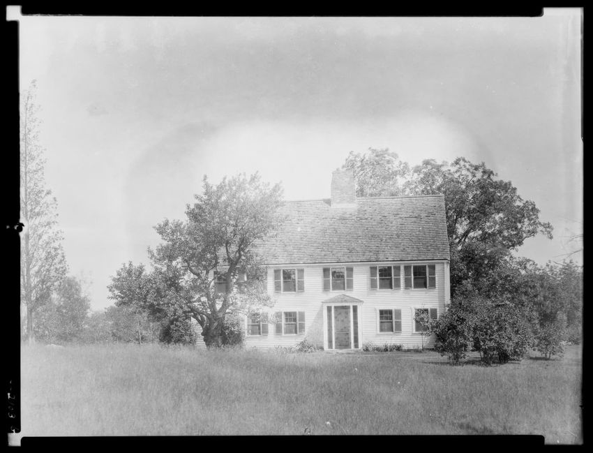 The image depicts Buckman Tavern, a historic building located in Lexington, Massachusetts. It is a large wooden structure with multiple windows, shutters, and dormer windows on the roof. A prominent door is situated at the center, flanked by a small porch. Leafless trees are visible in the foregroun...