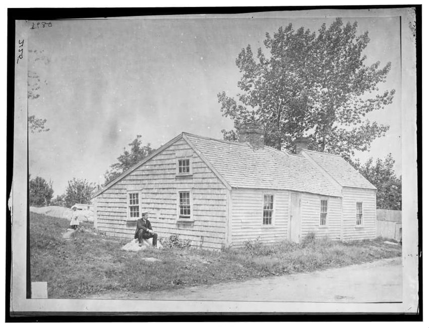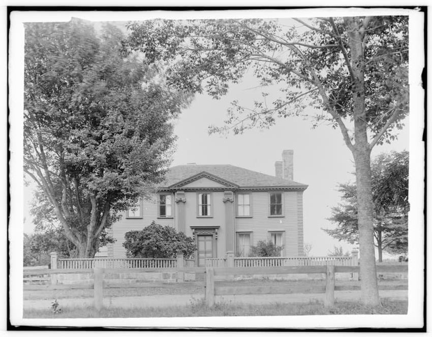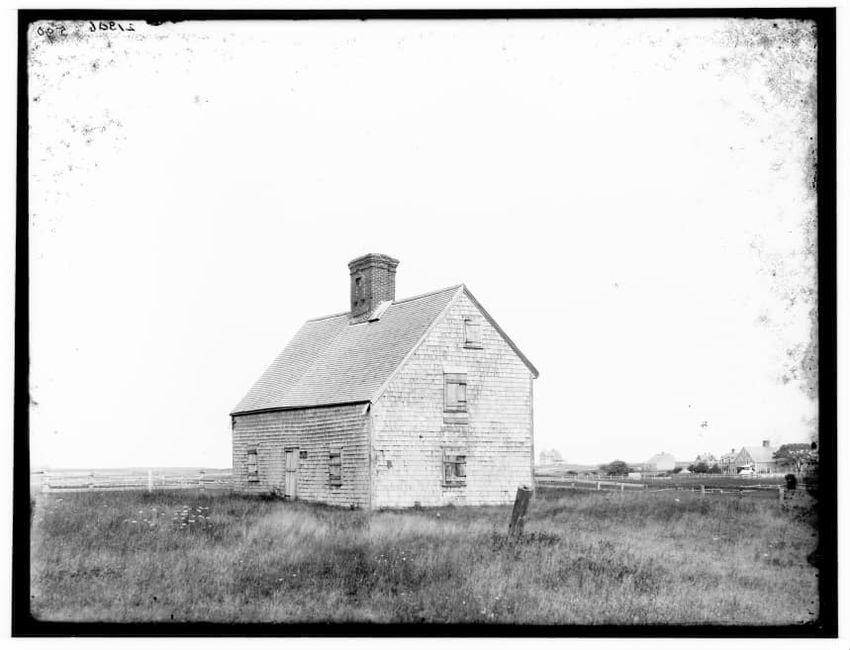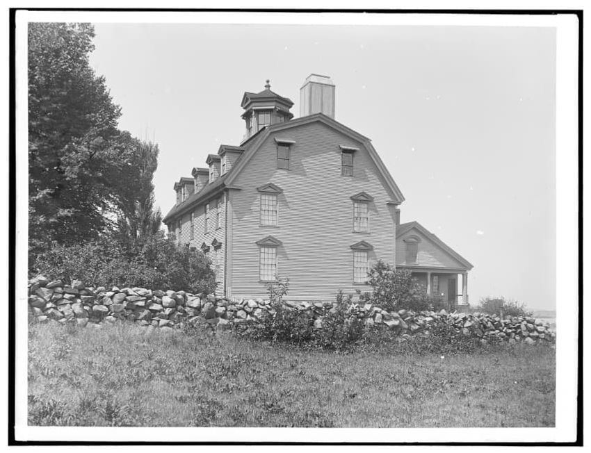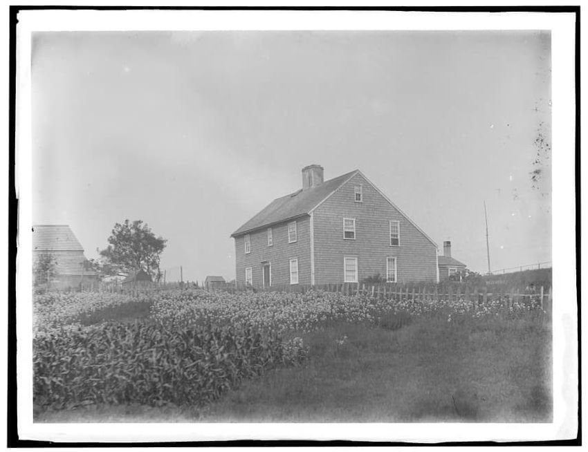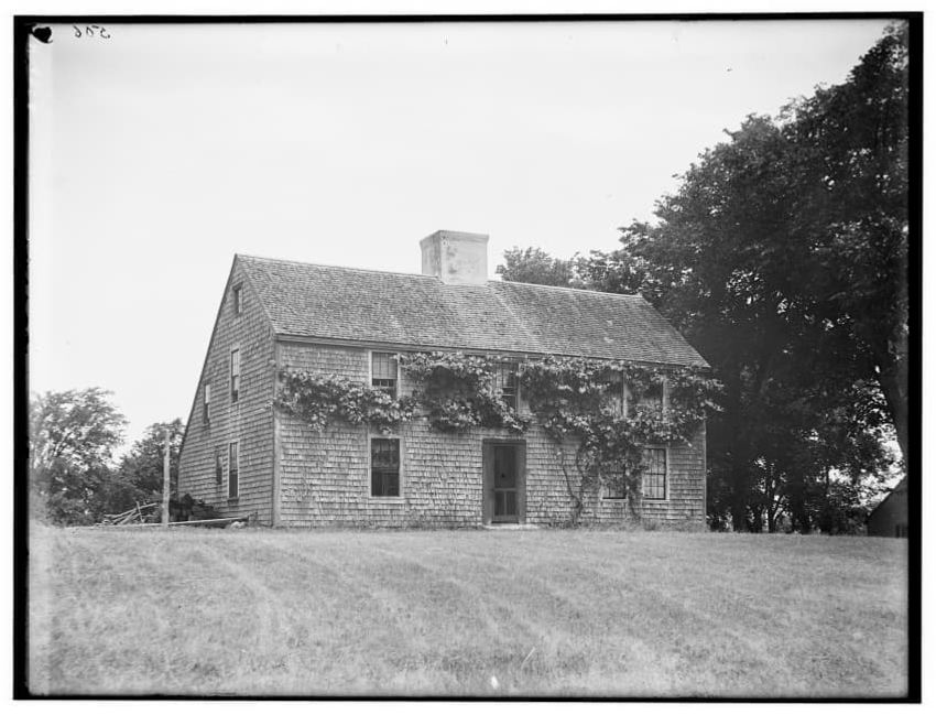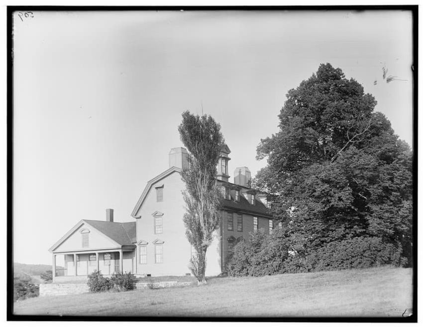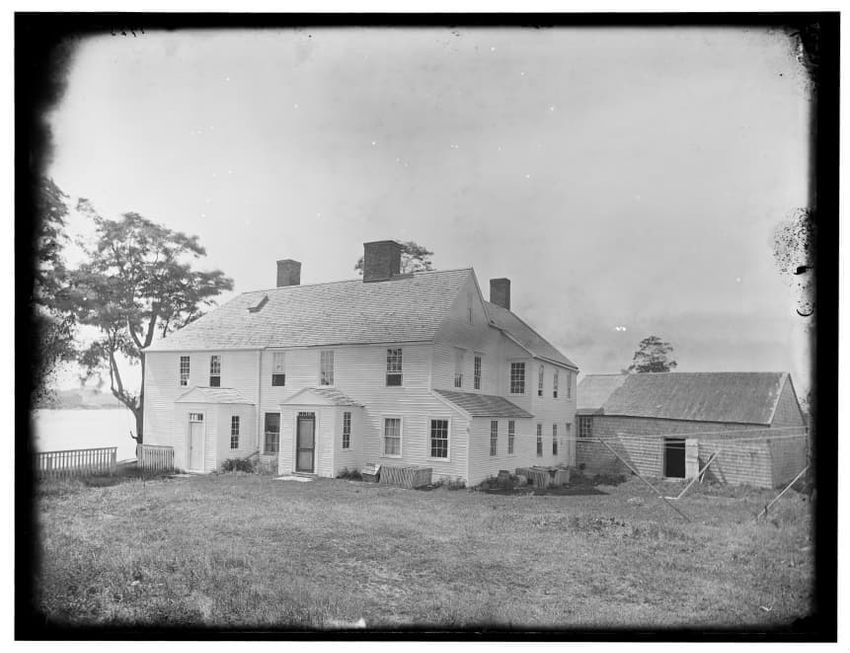 The image depicts Buckman Tavern, a historic building located in Lexington, Massachusetts. It is a large wooden structure with multiple windows, shutters, and dormer windows on the roof. A prominent door is situated at the center, flanked by a small porch. Leafless trees are visible in the foregroun...
