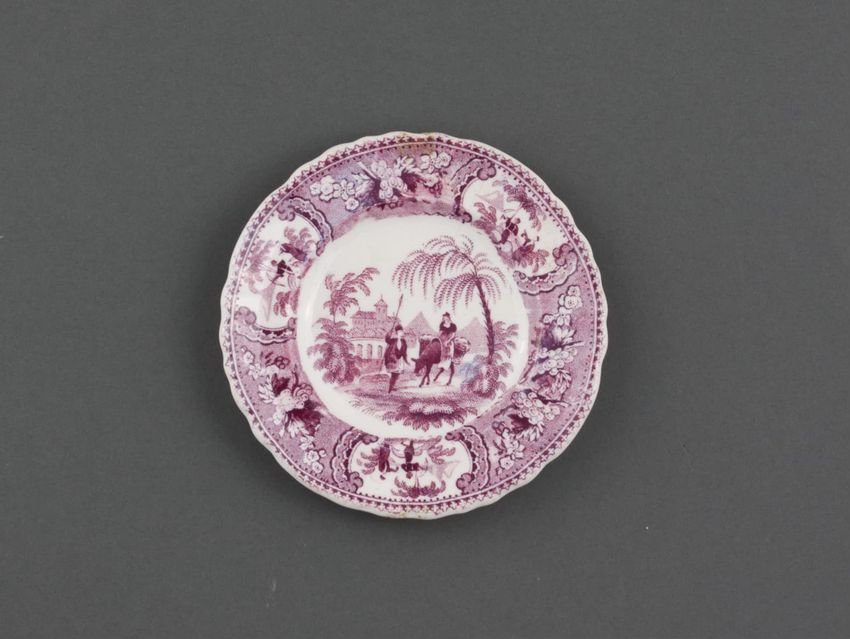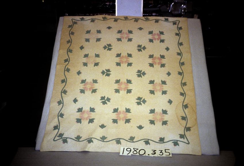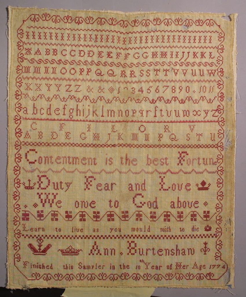 Alphabet sample; natural linen ground; small sampler (acc # 1977.562; 2 1/2" x 3 1/4") sewn onto lower left corner of larger sampler (7 3/4" x 7"); polychromatic. Alphabets: #1-complete; #2 - complete; #3-missing "J"; #4 - "A,D,G,G,M,Q,M,N,H,Y"; numbers: "1-12"