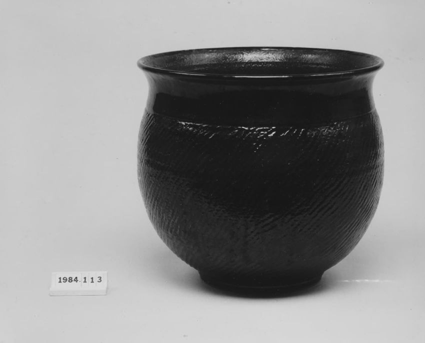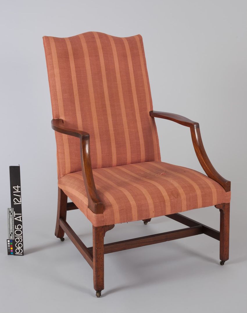 Easy chair. Black walnut front legs, side, and medial stretchers; soft maple rear legs, rear stretchers, and all other secondary wood except for white pine cone-shaped arm supports. Serpentine crest rail and vertically rolled arms. Straight seat. Block and baluster turned side stretchers. Swelle...