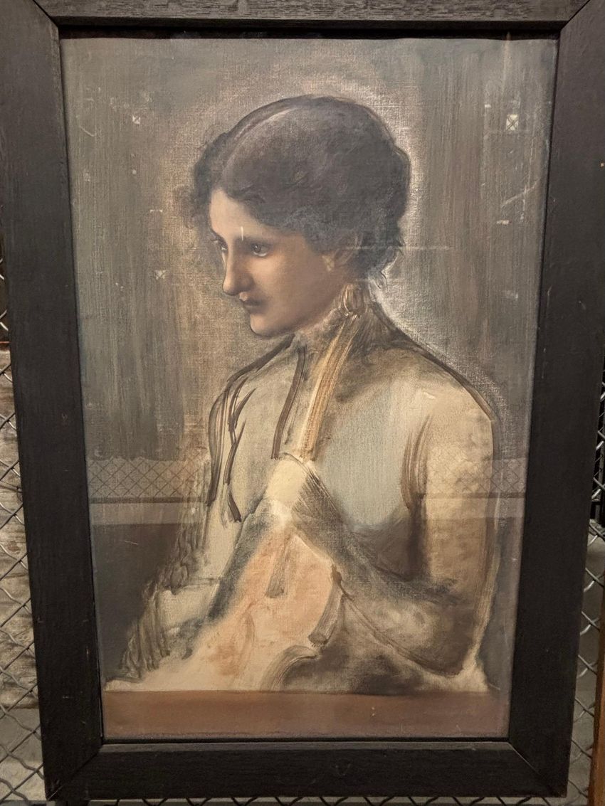Half-length portrait of Sara Norton as a young woman in profile facing right, holding a violin.
