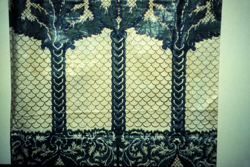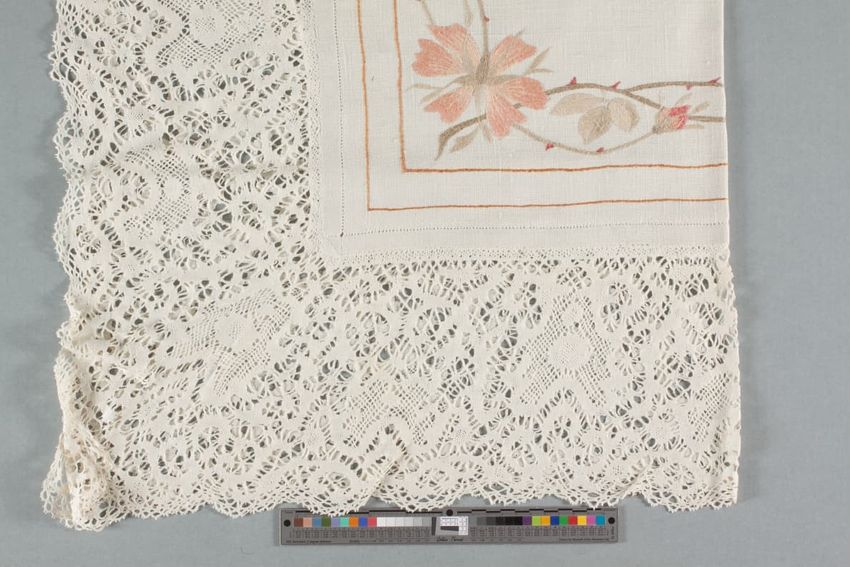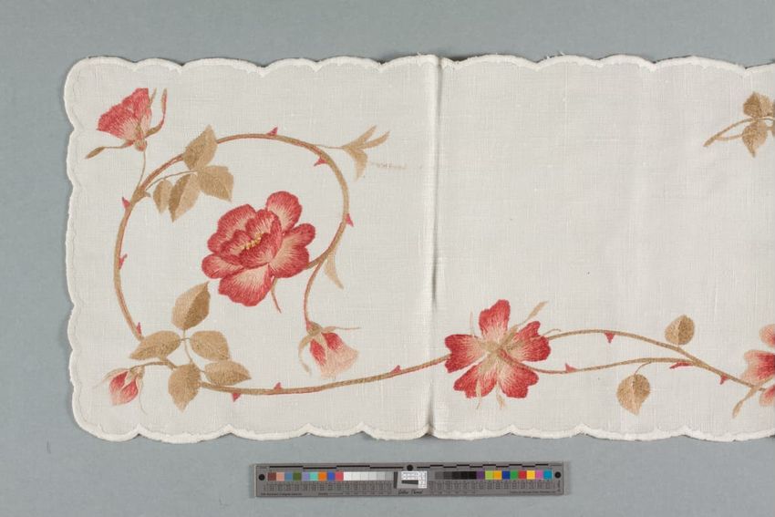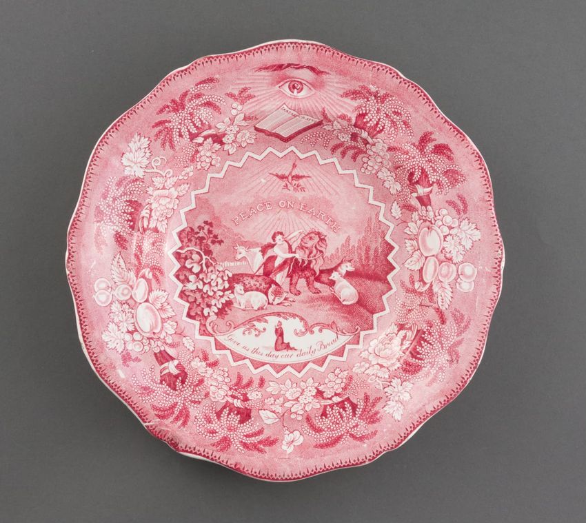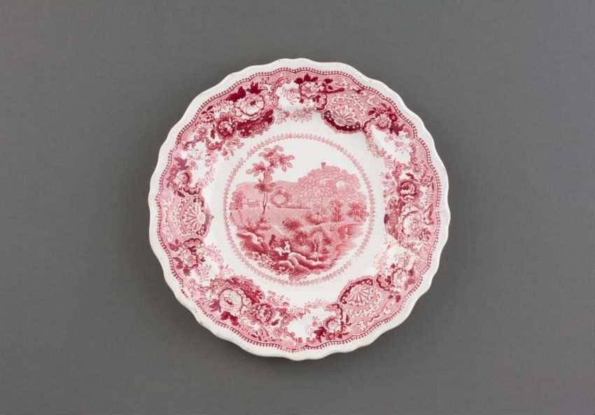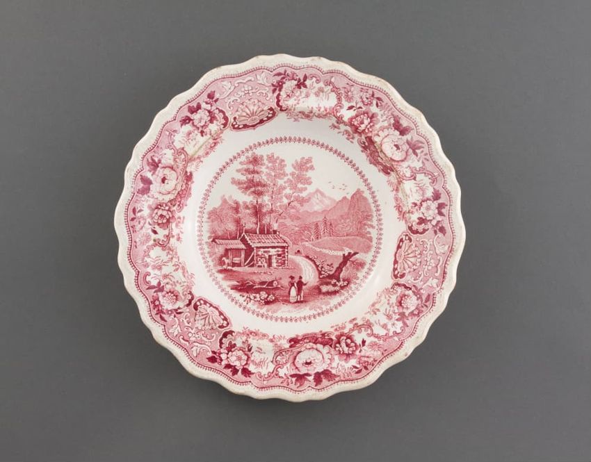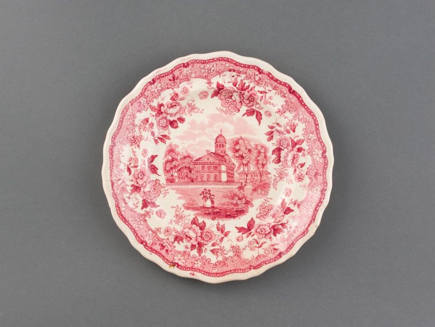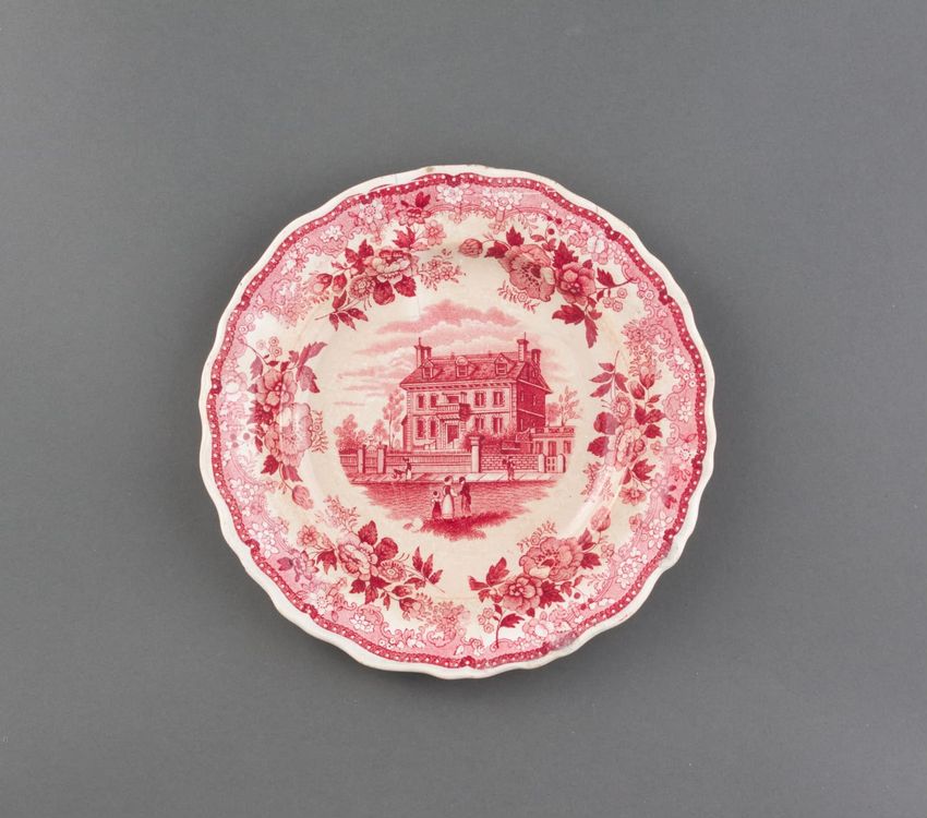 Earthenware plate with scalloped rim and red transfer-print depiction of the historic Hancock House (built 1734-1737), Boston, Massachusetts. The view of the house, a three-story Georgian-style mansion constructed of granite, is from across the cobblestone street and includes passersby on the sidewa...