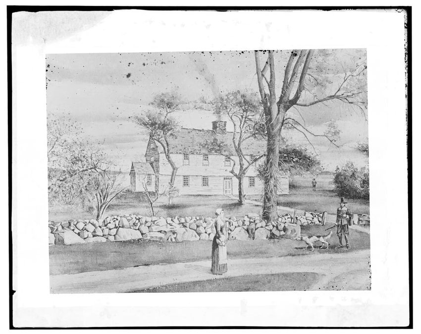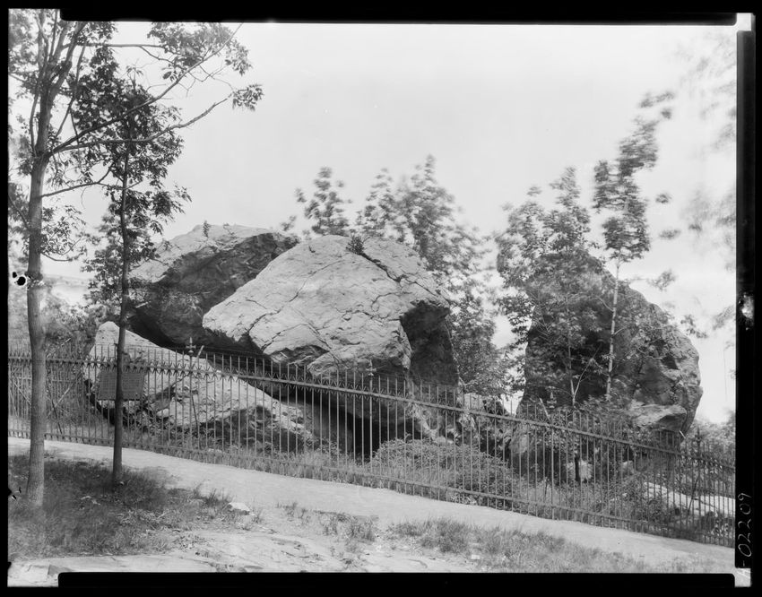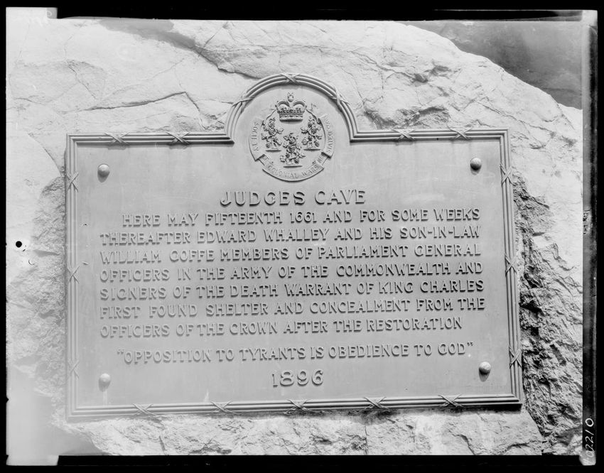 The image depicts a tablet at Judges Cave in New Haven, Connecticut. The inscription on the tablet details how Edward Whalley and his son-in-law, William Goffe, sought refuge there starting May 15, 1661, after being signers of the death warrant of King Charles I. It also includes the phrase "Opposit...