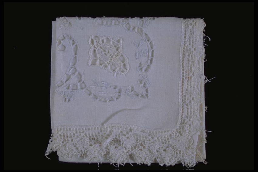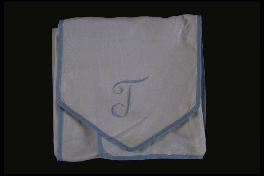 Linen napkin case w/ blue embroidered "T"; square in center w/ cardboard insert and 4 flaps which fold into center to form a cover; 2 flaps pointed at ends; case is white w/ blue banding around edges.