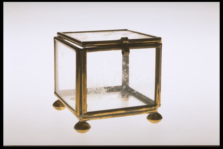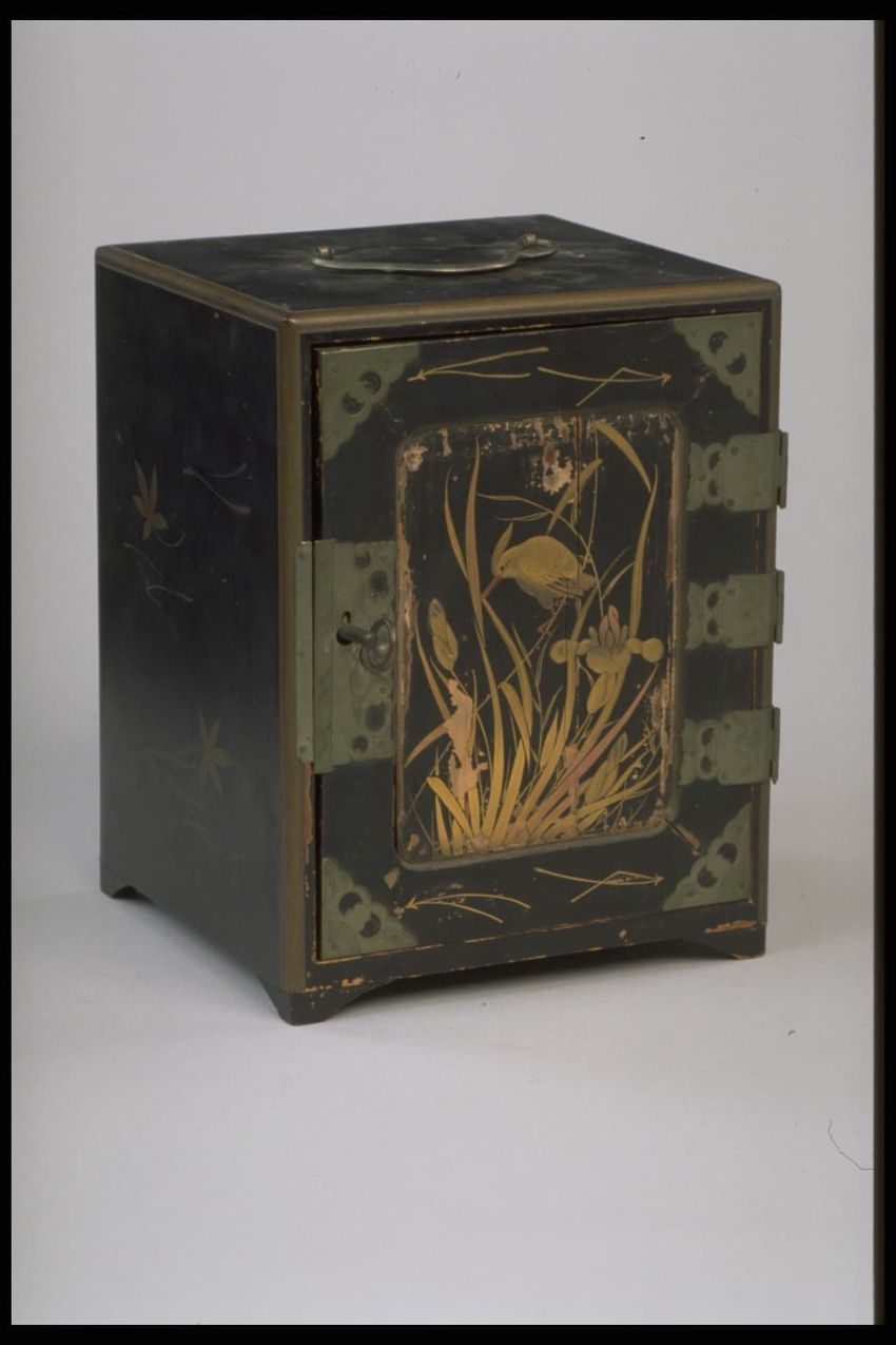 Small rectangular black lacquered box w/ bronzed edges on 4 bracket feet; hinged front door w/ inset panel w/ gilded, crested bird, orchids and curvalinear leaves; sides and top have gilded Japanese maple leaves and curvalinear line decorations; front door has applied pierced, incised hinges, lock p...