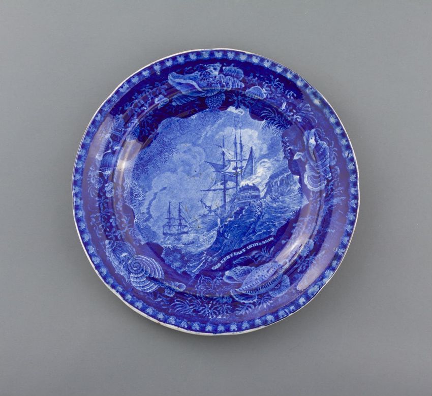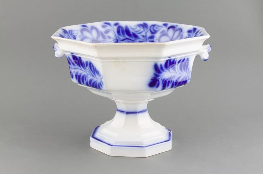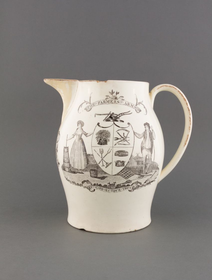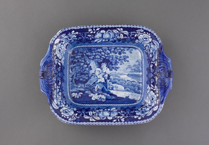 Blue transfer-printed earthenware teapot. Rectangular molded finial. Foliate and diamond design adorns the cover, rim, handle, and spout. Scene of Jedburgh Abbey on exterior body and spout.