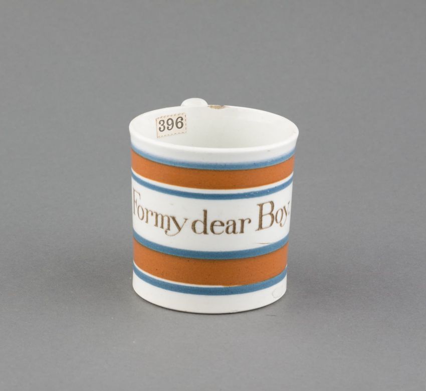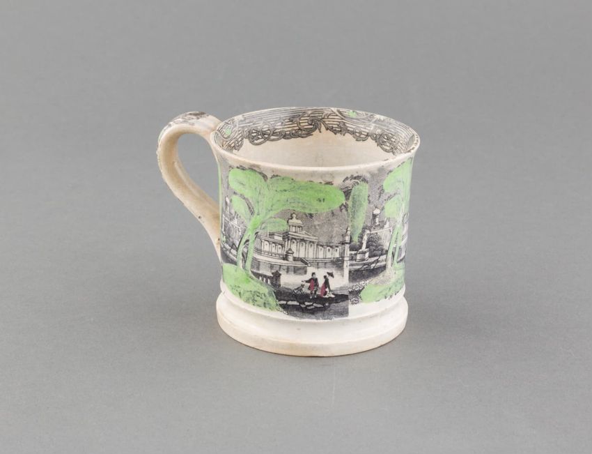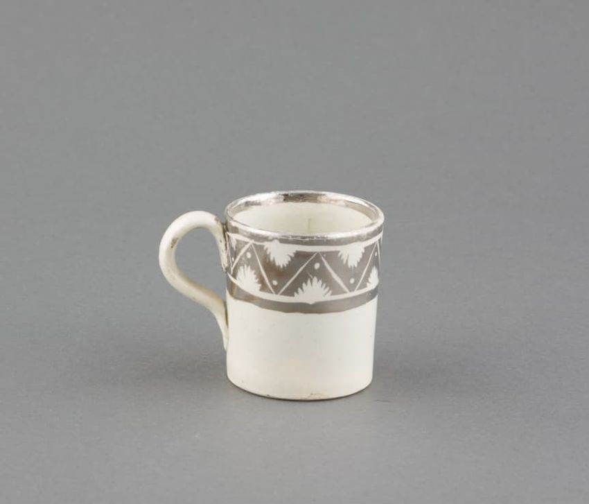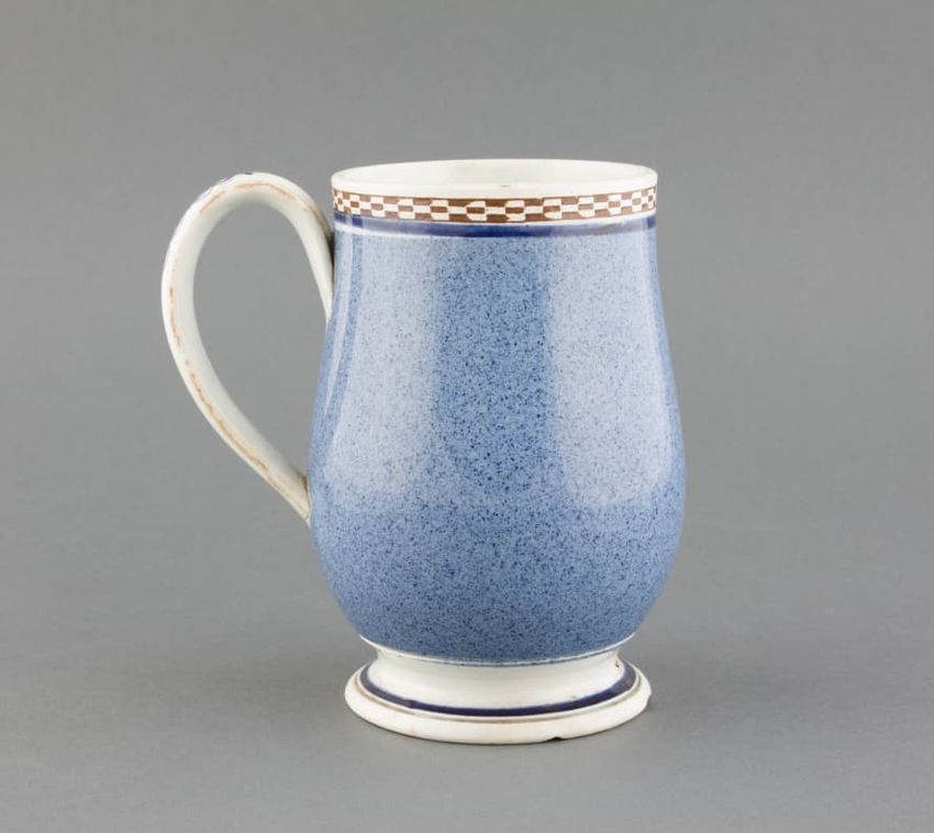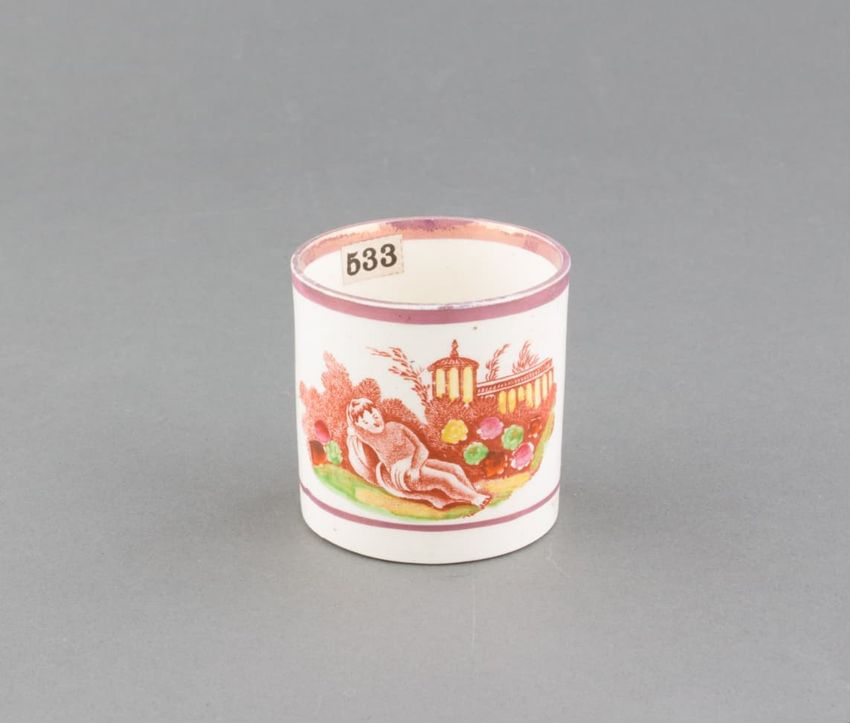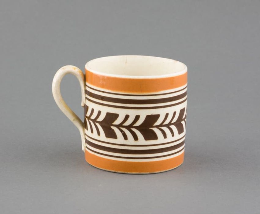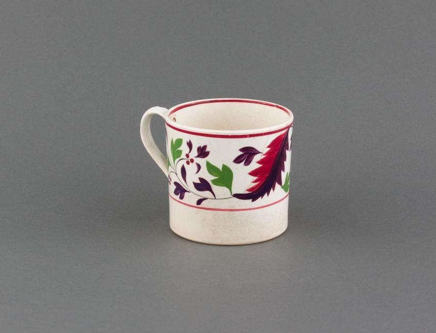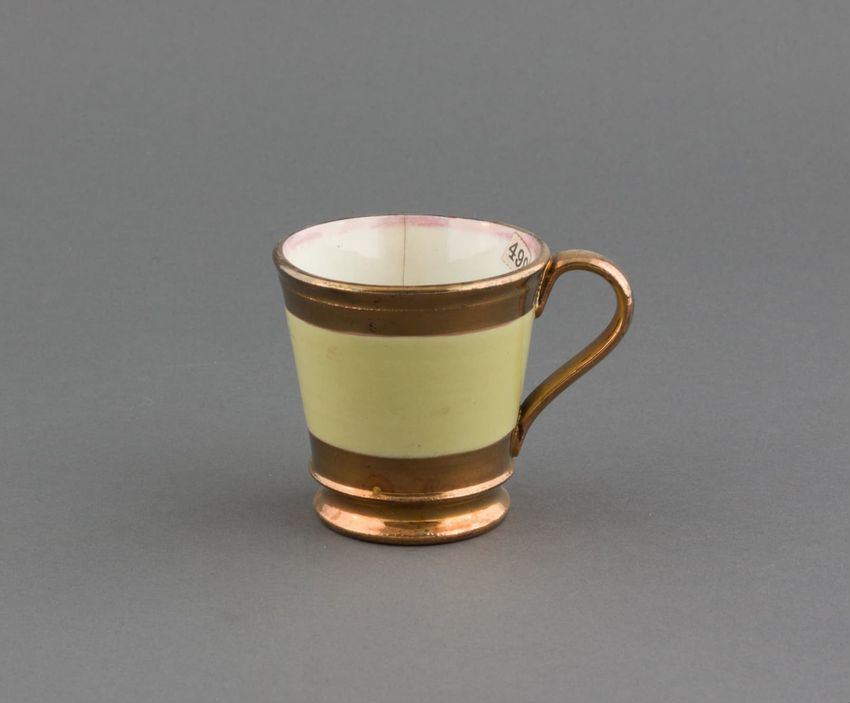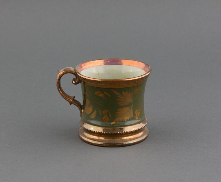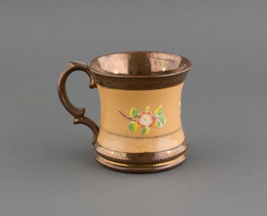 Lusterware mug. Concave body, shaped and beaded base, beaded rim, and spurred loop handle. Copper luster with mustard orange band around middle and applied floral decorations, overpainted with green, yellow, red, and brown. Interior of mug coated in luster.