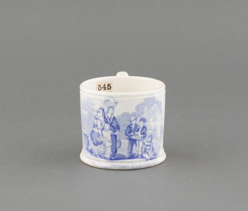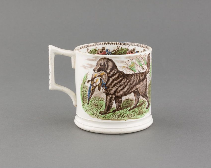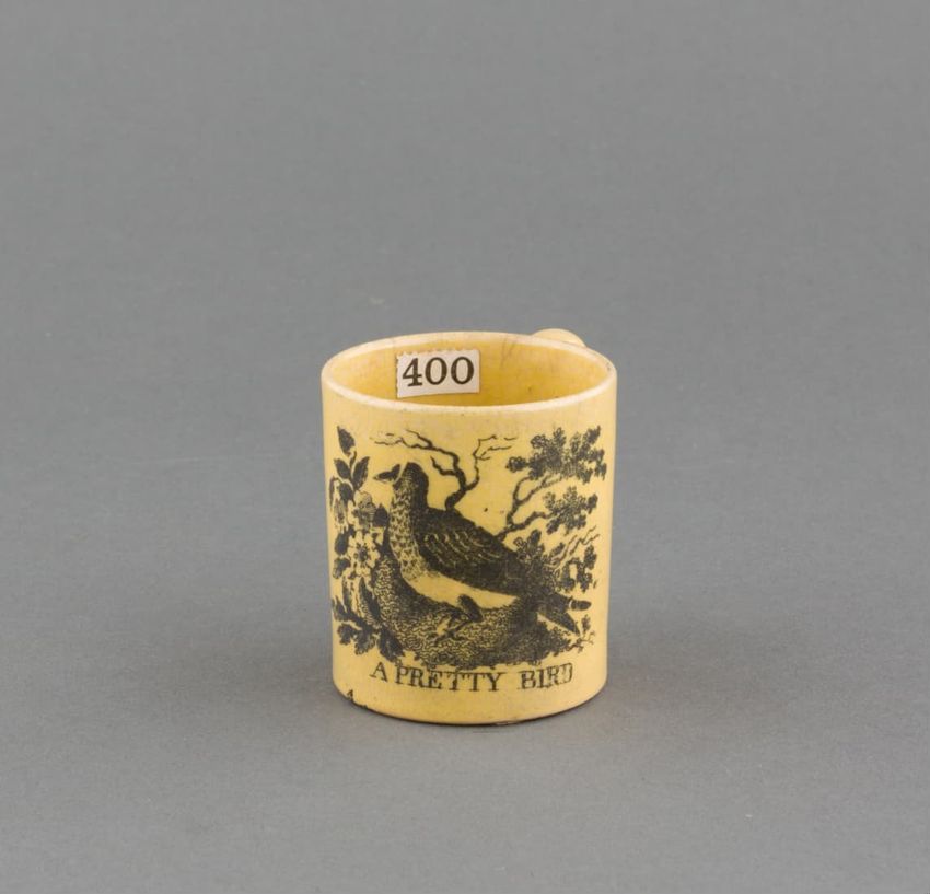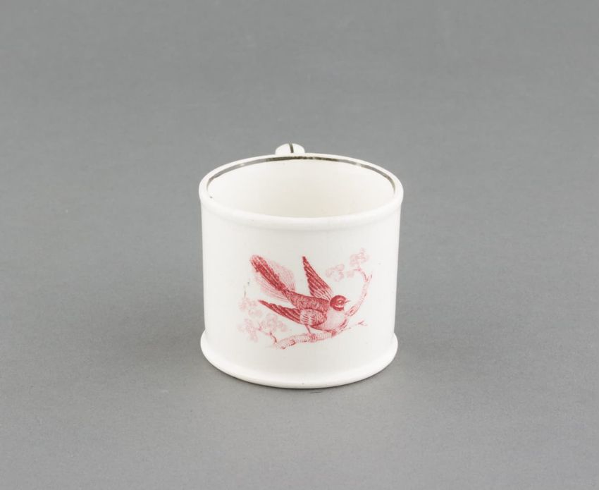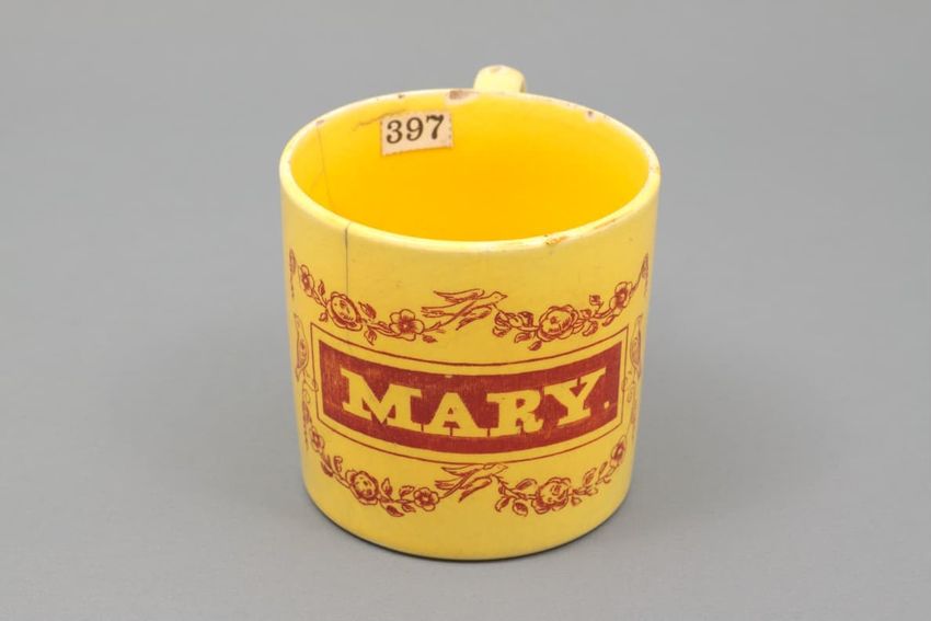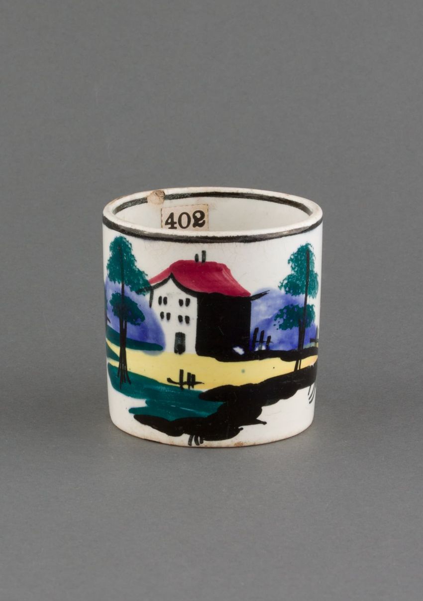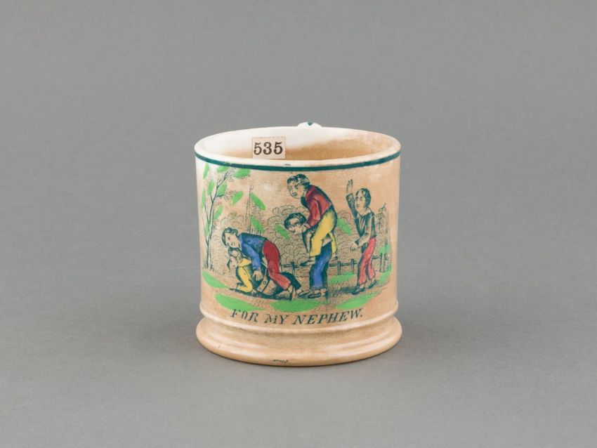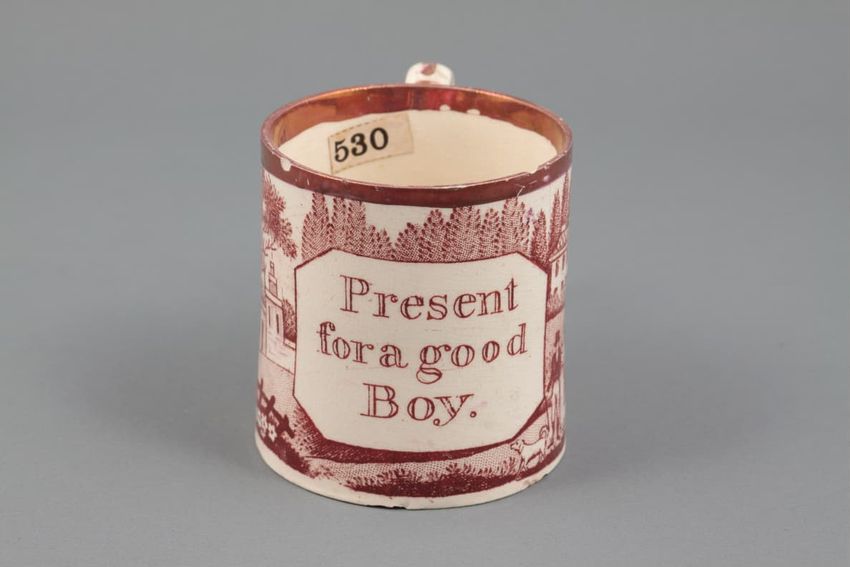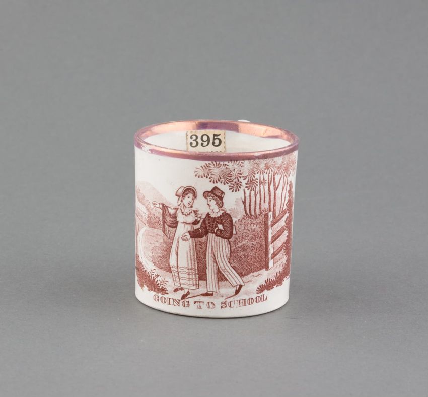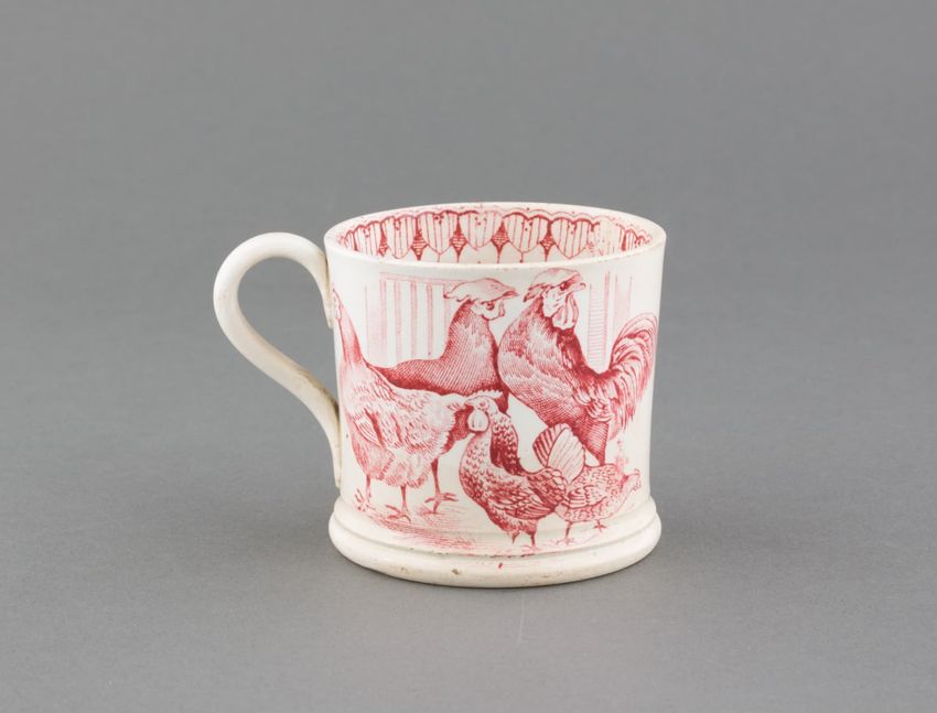 Lusterware mug. Concave body, shaped and beaded base, beaded rim, and spurred loop handle. Copper luster with mustard orange band around middle and applied floral decorations, overpainted with green, yellow, red, and brown. Interior of mug coated in luster.