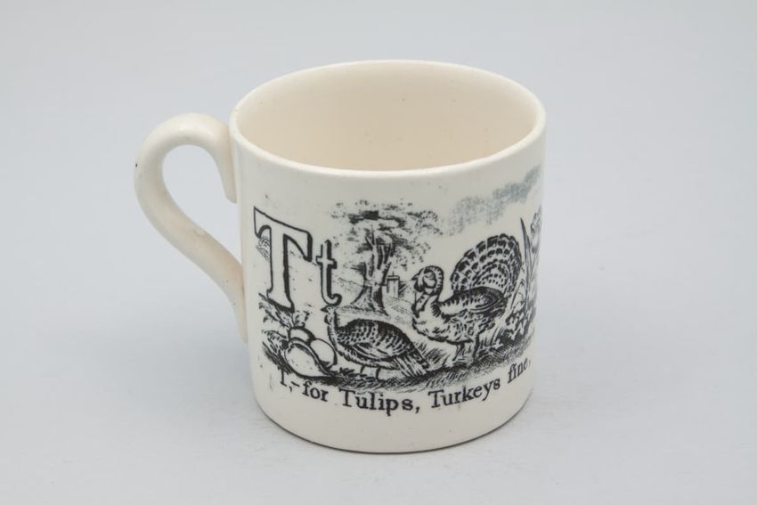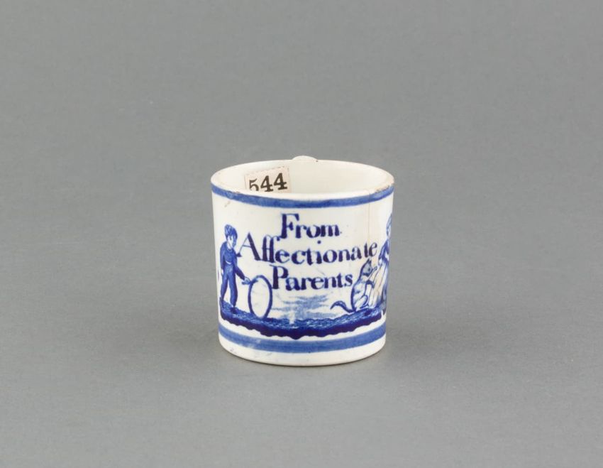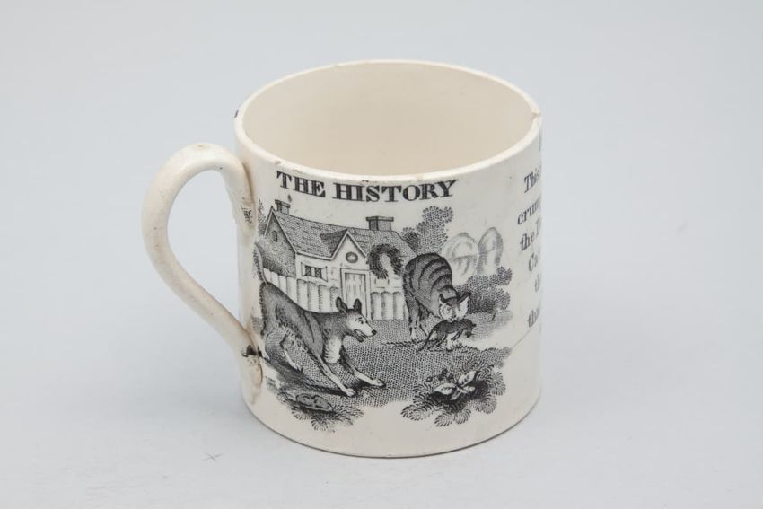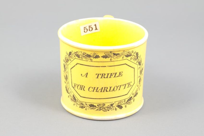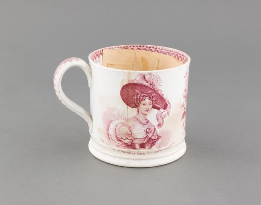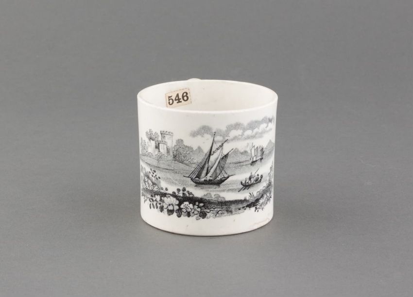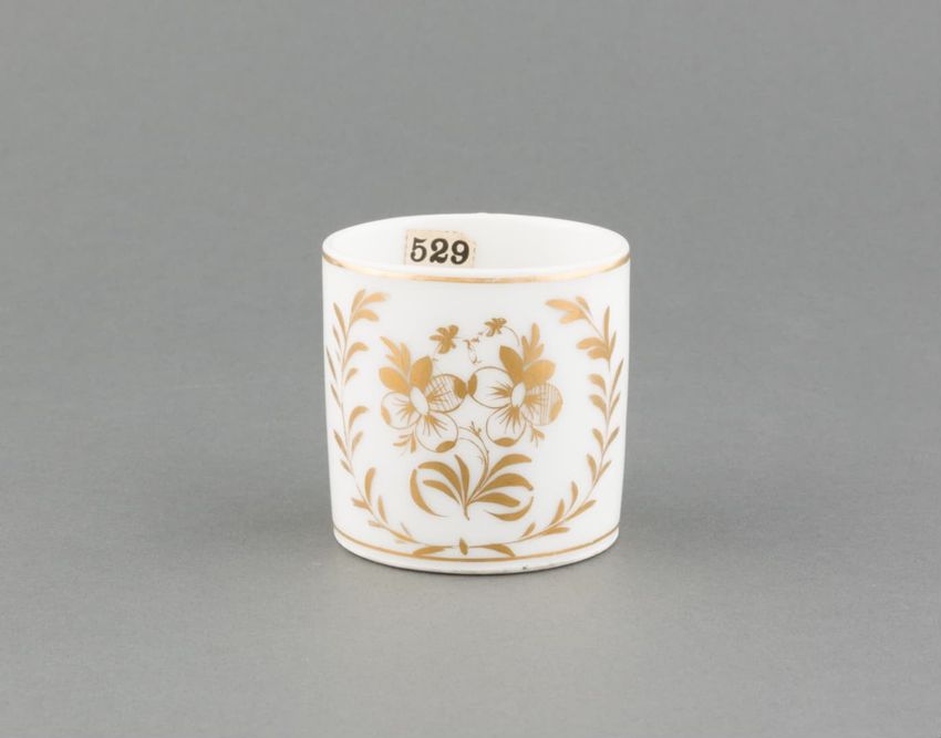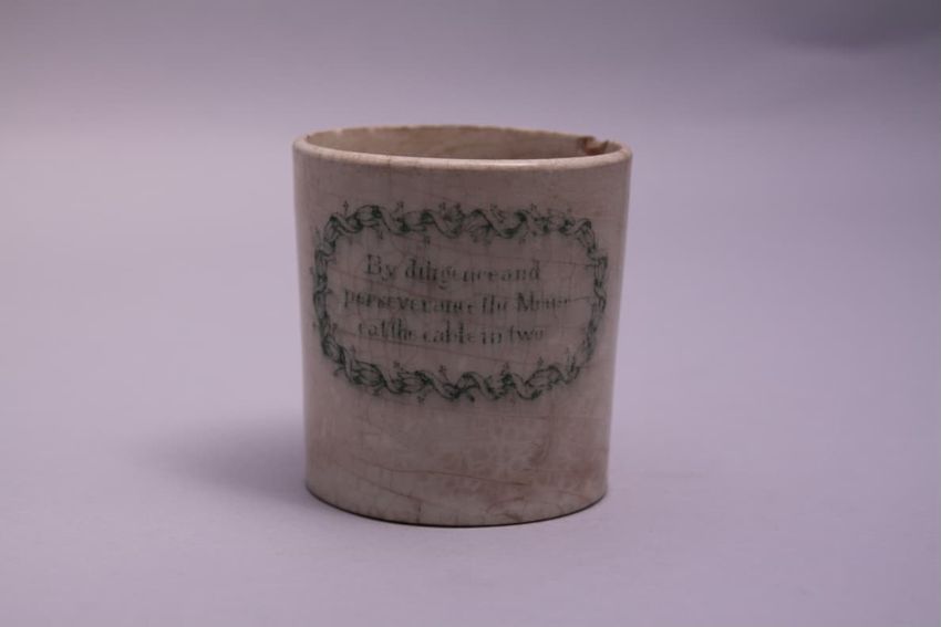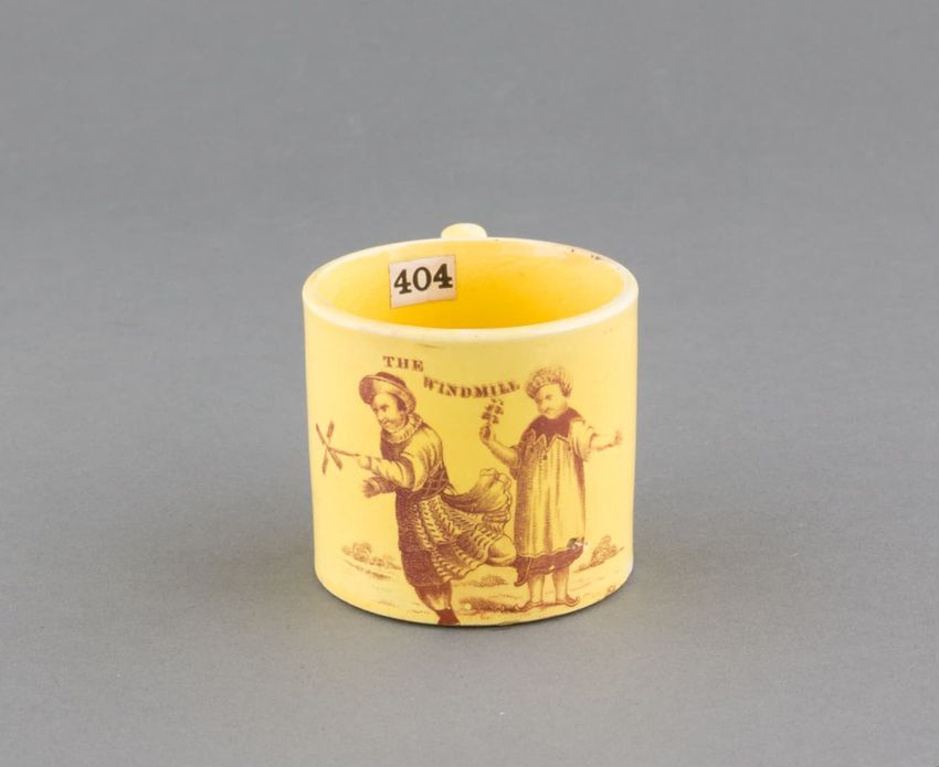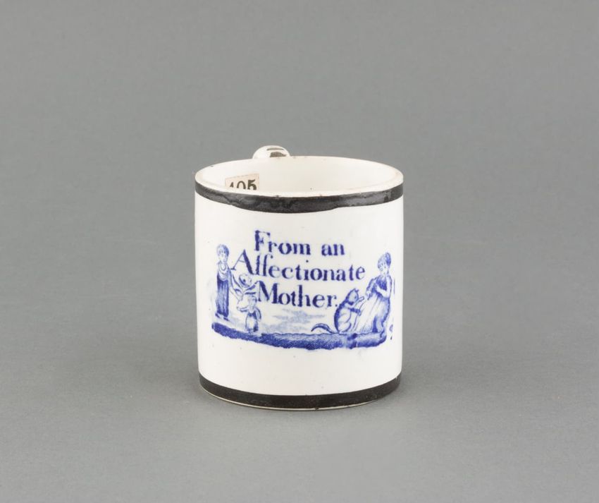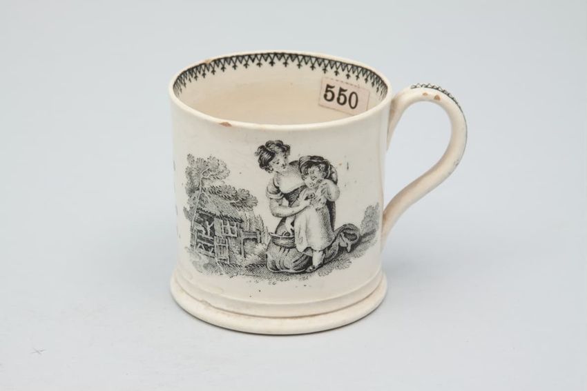 Lusterware mug. Concave body, shaped and beaded base, beaded rim, and spurred loop handle. Copper luster with mustard orange band around middle and applied floral decorations, overpainted with green, yellow, red, and brown. Interior of mug coated in luster.