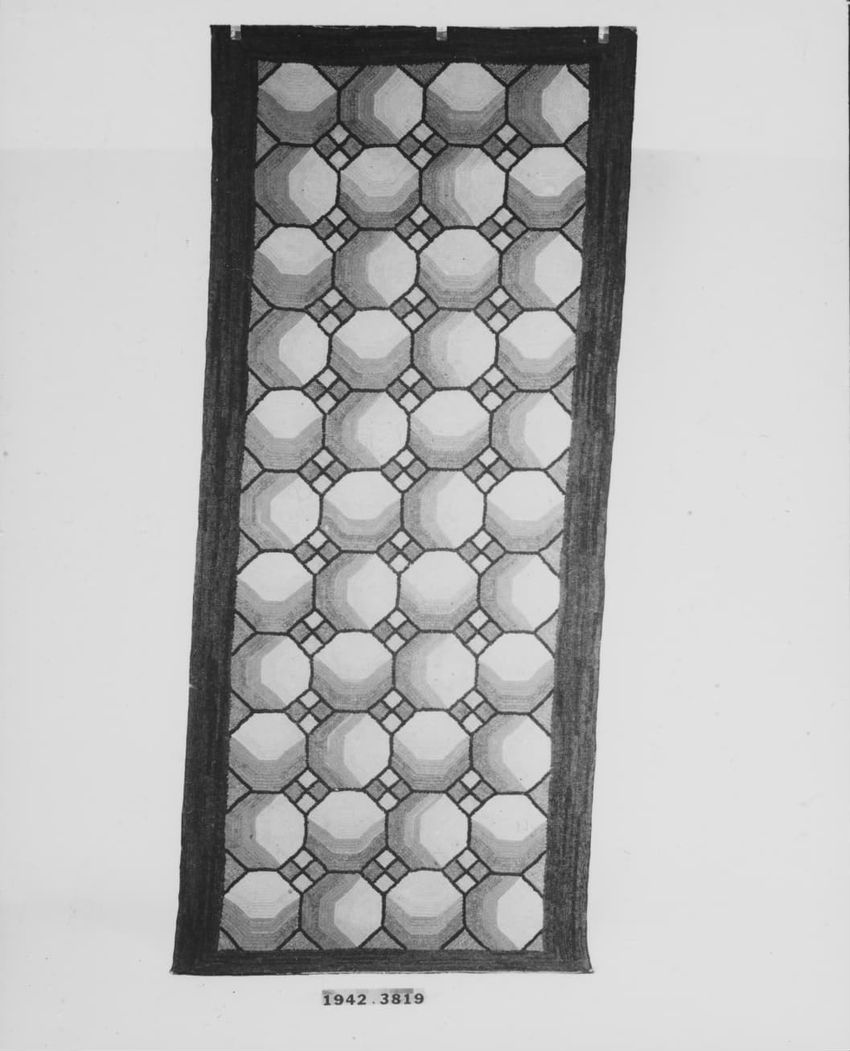 Hooked rug with geometric pattern of beige octagons. Multi-colored border.