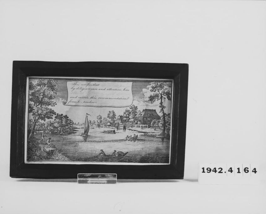 Certificated decorated with a depiction of a landscape with water, boats, fishermen; shoreline with horses; stock reg.