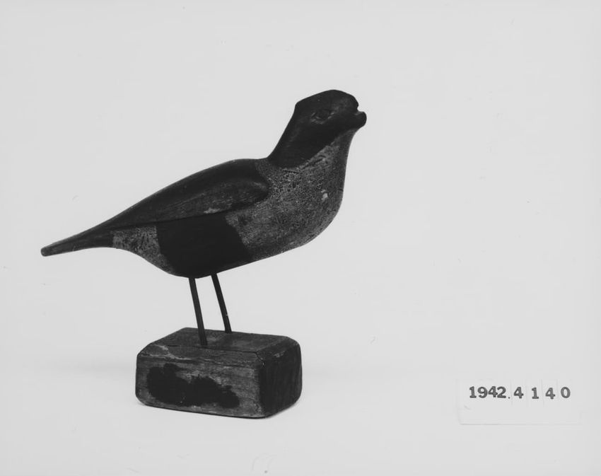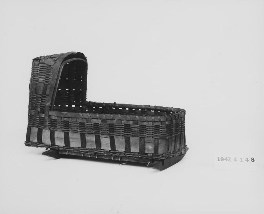 Natural; ovoid, sewn straps; domed lid; chip-carved pinwheel dec
