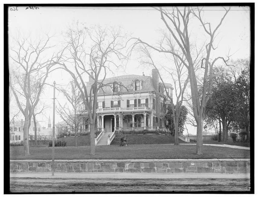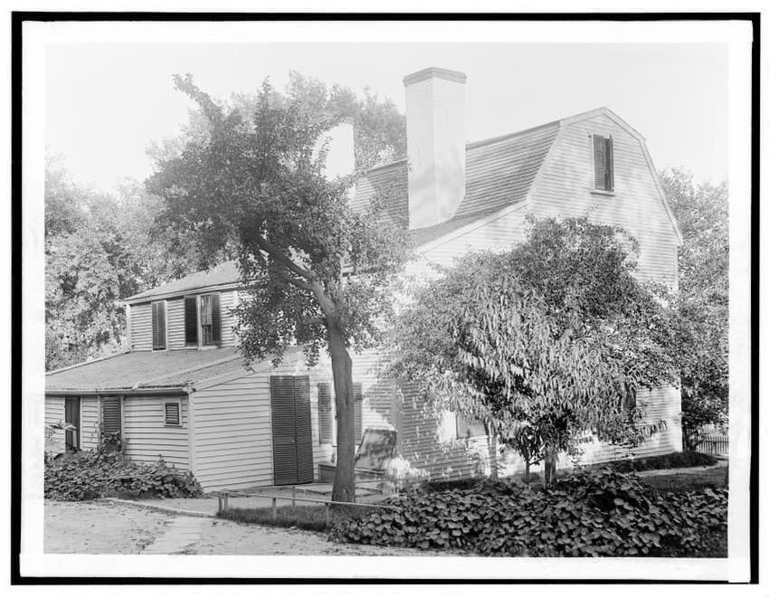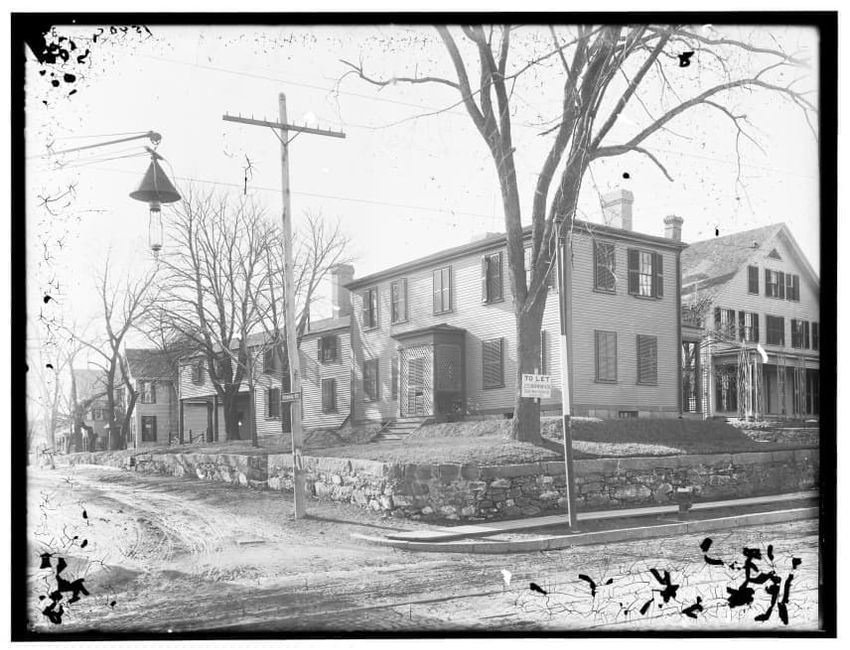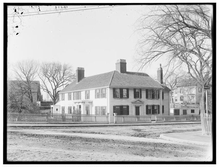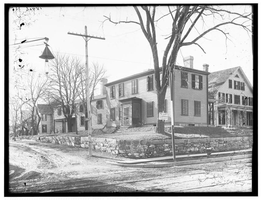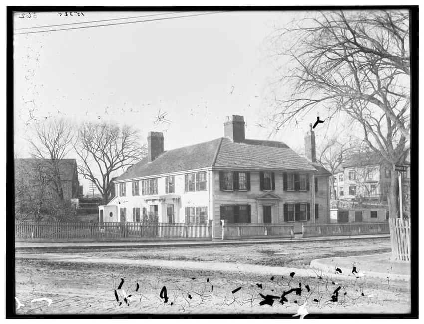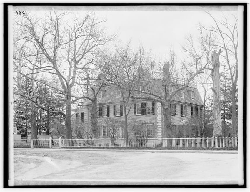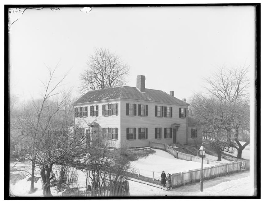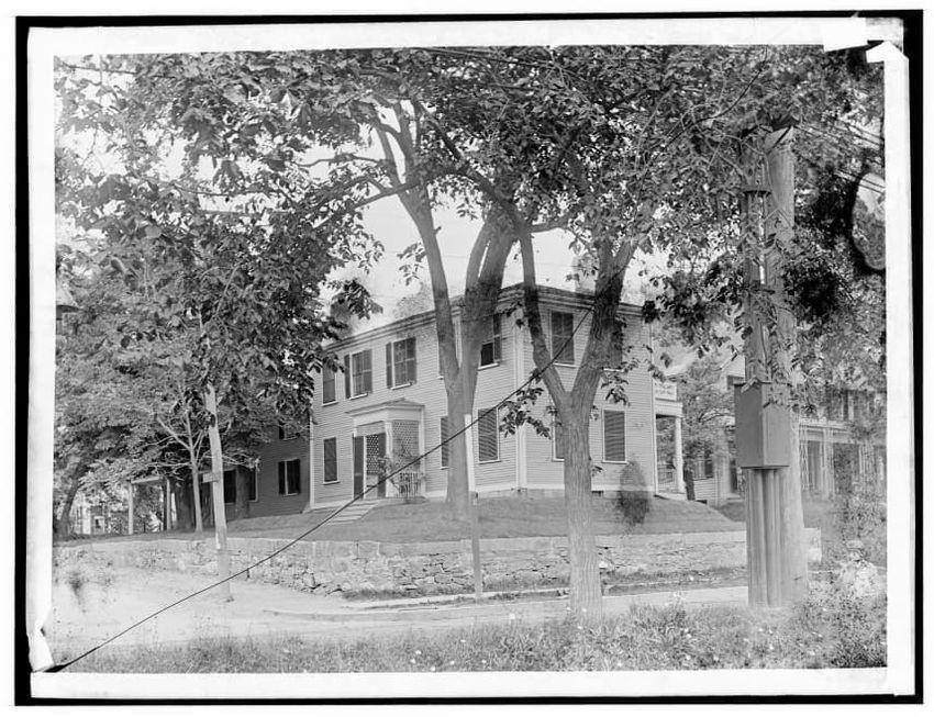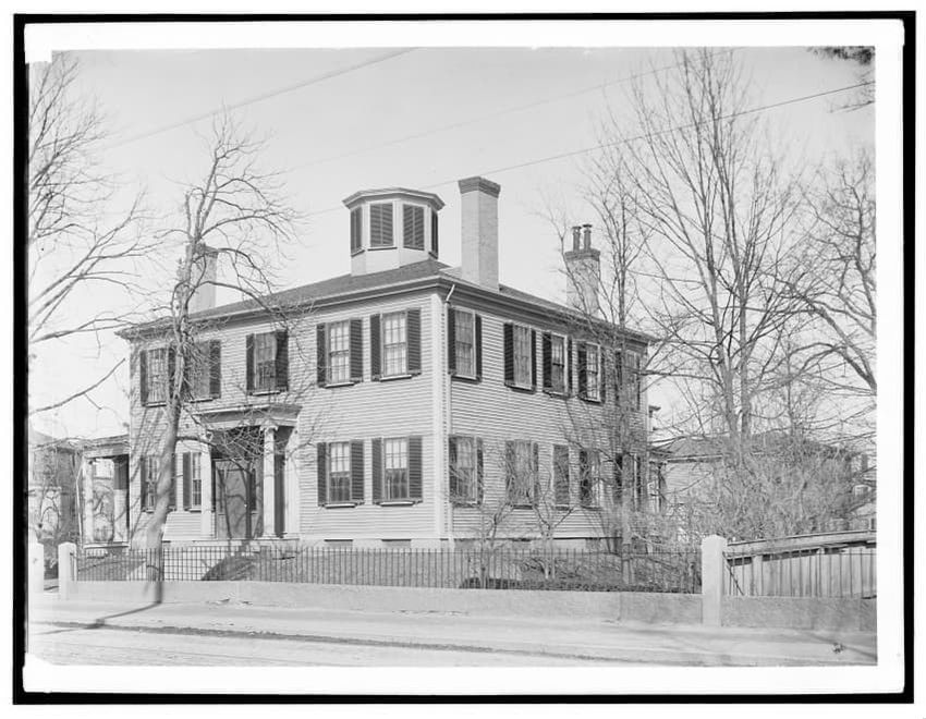The image shows the Hunt House, a large, ornate, two-story building in Dorchester, Boston, Massachusetts. The house features intricate architectural details, including decorative brackets, a central entrance with a small canopy, and symmetrical windows. A small set of stairs leads to the main door, ...