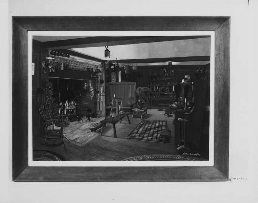 Framed watercolor painting of the Pine Kitchen, Pembroke Room at Beauport, Sleeper-McCann House; fireplace with fire blazing.