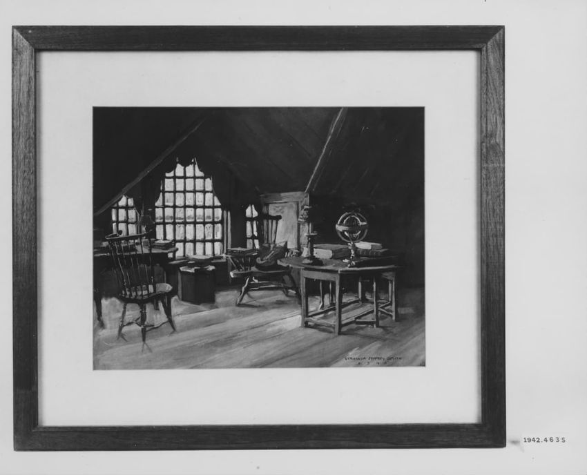 Framed watercolor painting of the Mariner's Room at Beauport, Sleeper-McCann House; view of window.