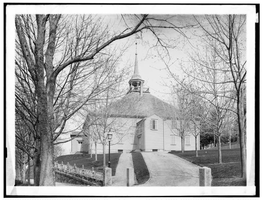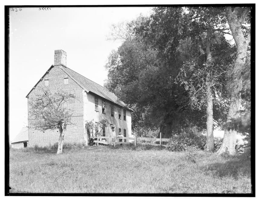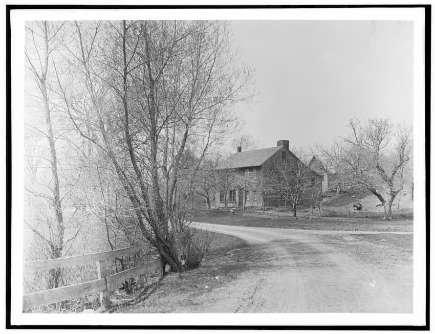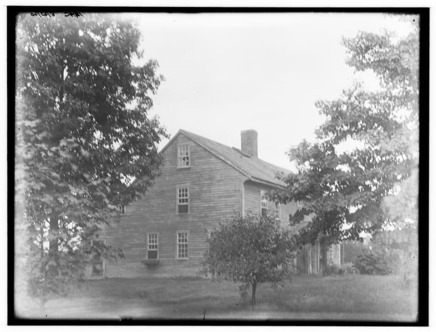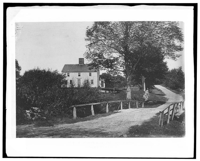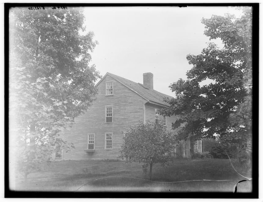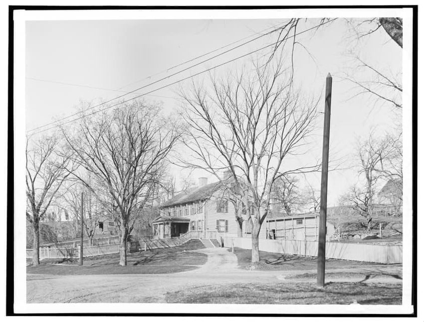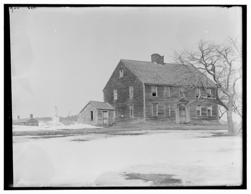 The image depicts the Old Peaslee House in Haverhill, Massachusetts. It shows a large, two-story wooden structure with multiple windows and a chimney. In the foreground, there is a tree with bare branches. Additionally, a small outbuilding is visible nearby. Snow covers parts of the ground, and in t...
