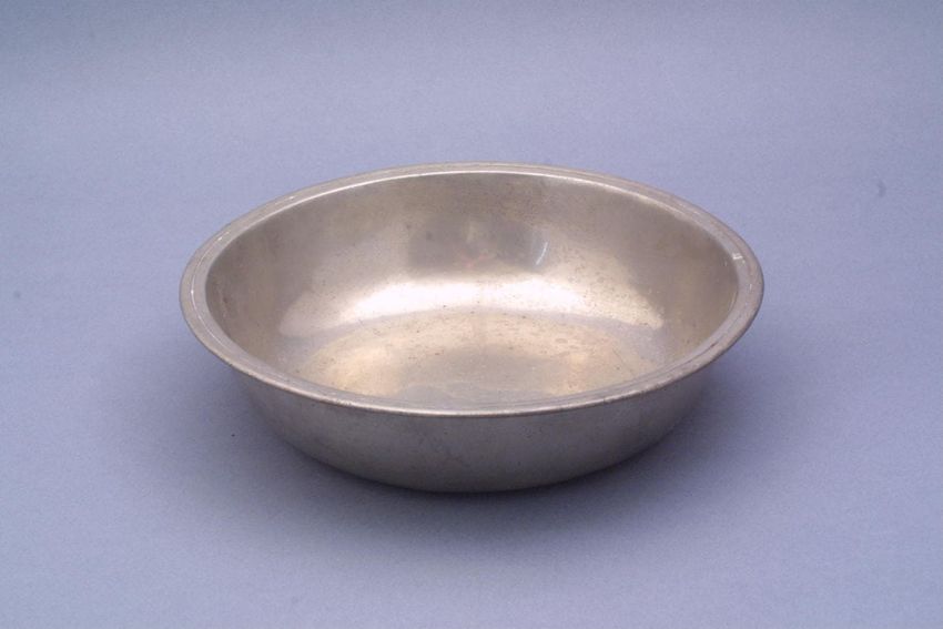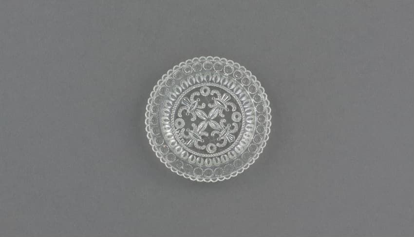 Blue and white; cell, trellis, spearhead and floral border; right-oriented landscape scene with tree on rocks, foreground; two-story pavillion atop rocks with trees and one story building, right, rear; bridge with two figures, center with rocks and tree; second rocky outcropping with one story pavil...