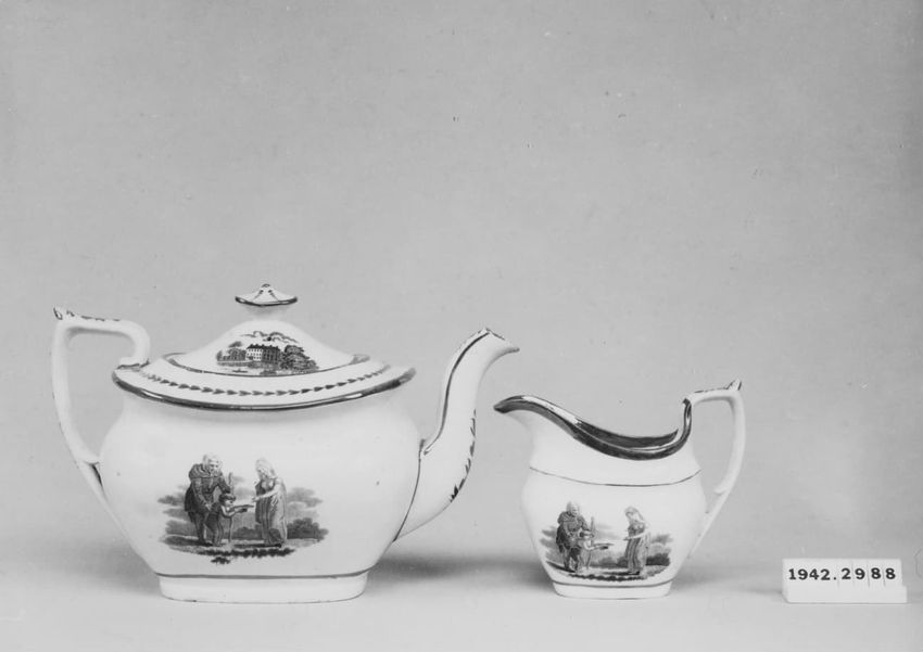 Brass watering can with an oval body, flat bottom, quarter-hinged lid, spout, and handles at the side and top.
