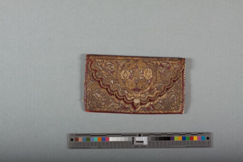 Small trunk, leather studded with brass nails and lined with a tan wallpaper decorated with a white and green design. Old label inside reads: "ISSAC LIBBEY,/TRUNK MANUFACTURER,/and Dealer In/Valises, Carpet Bags,/and all kinds of Trunk Trimmings,/Rochester, N.H." This trunk belonged to John T. Gordo...