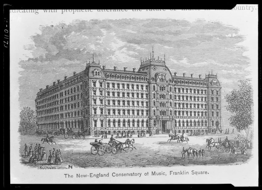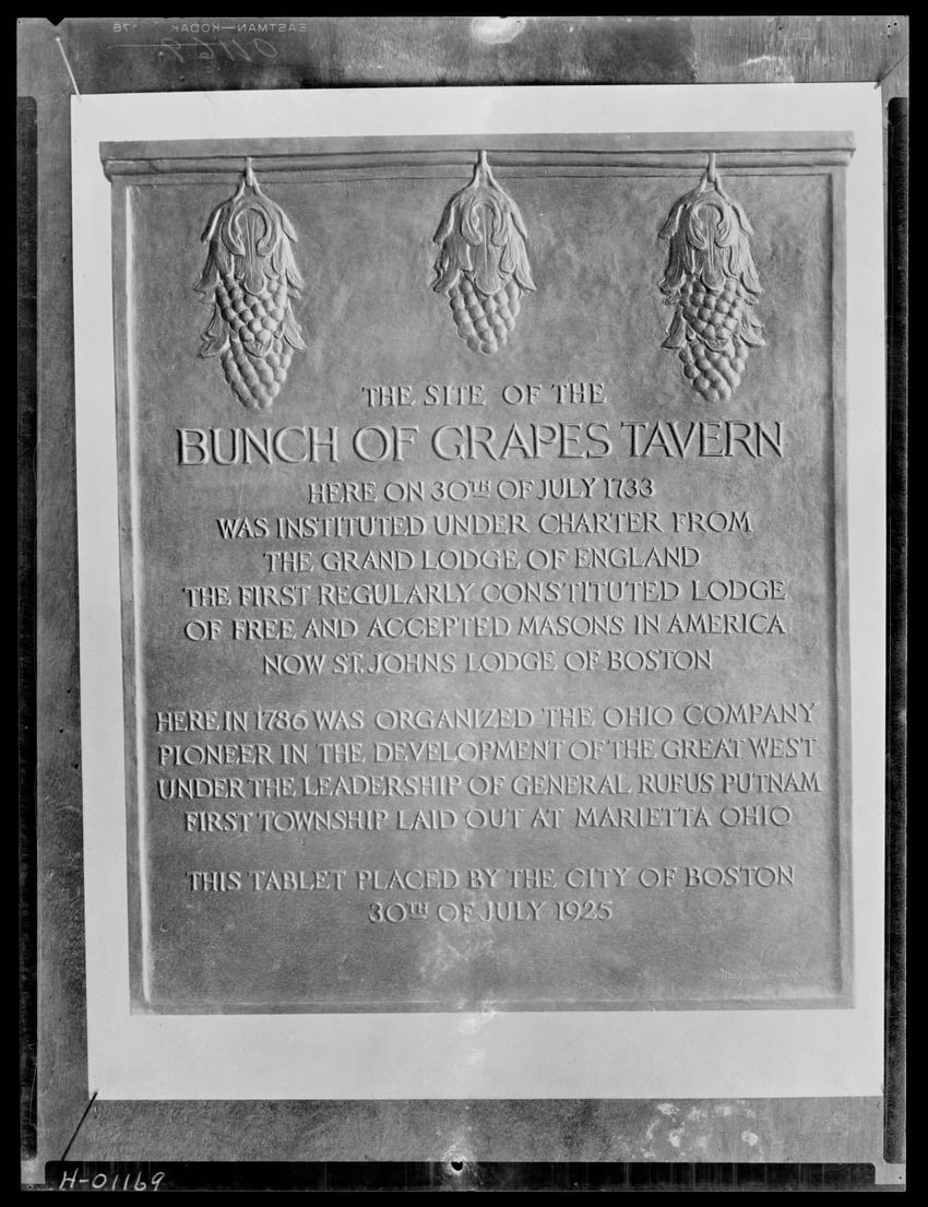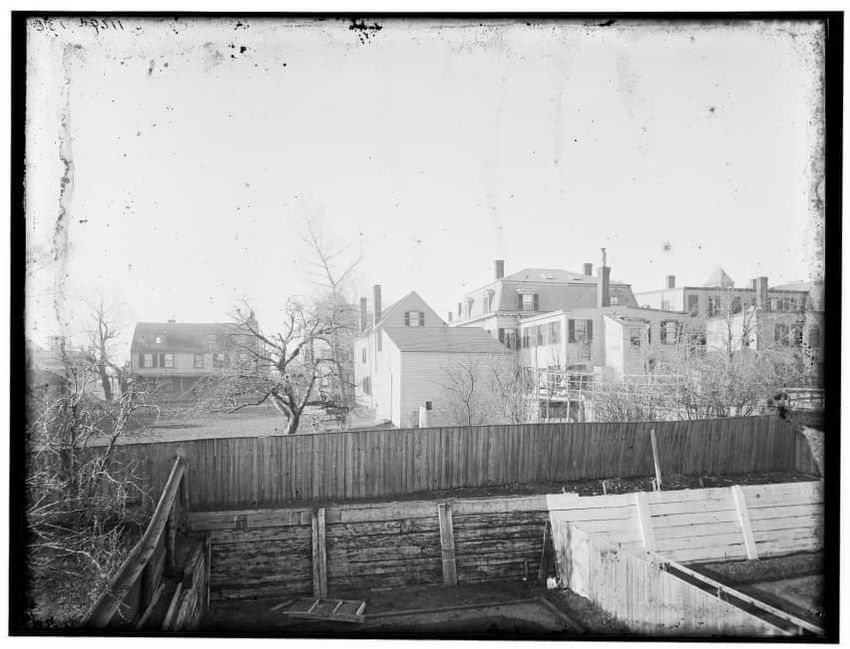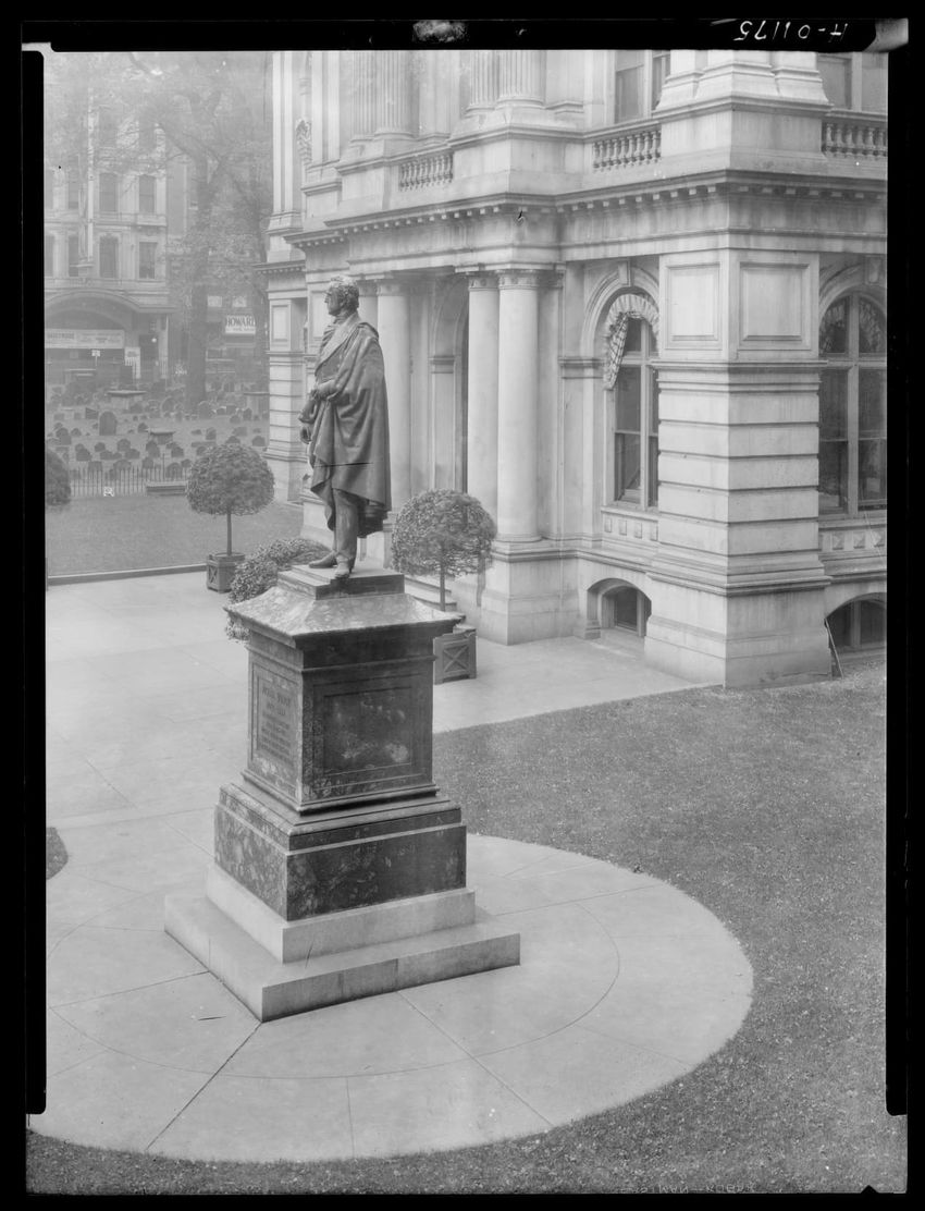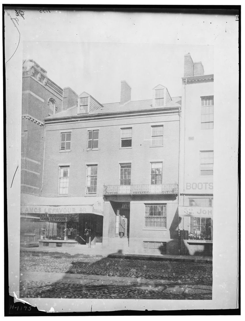 The image depicts Dock Square in Boston, Massachusetts. Prominent signs for businesses such as "C.H. Robinson & Co. Furniture &c.," "Kelley & Co.," and "S. Barnard Clothing" are visible on the buildings. People can be seen walking and interacting in the square, with a central statue or monument visi...