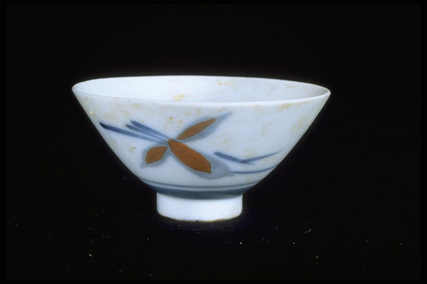 White, plain weave, heavily napt wool with 6- 1/4" wide candy striped bands at each end; repeating blue, white, red, orange, white, red. Side edges selvage; top and bottom edges bound.