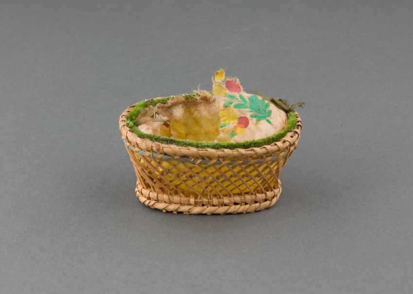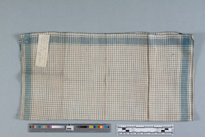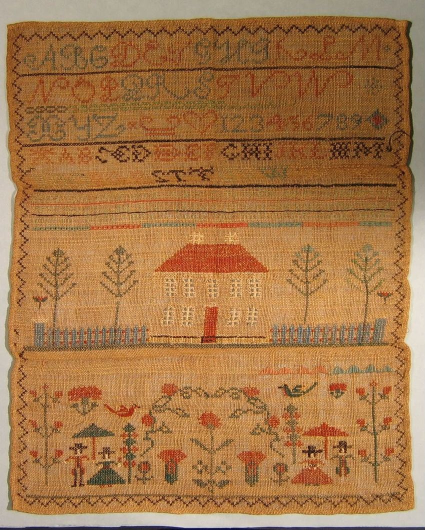 Alphabet verse sampler, cross stitch border. The lower half is embroidered with a house, trees, fence, flowers, birds and people. Alphabets: #1-missing "J","U", #2-"A-W", with some letters repeated. Numbers: "1-9"; cross stitch and satin stitch.