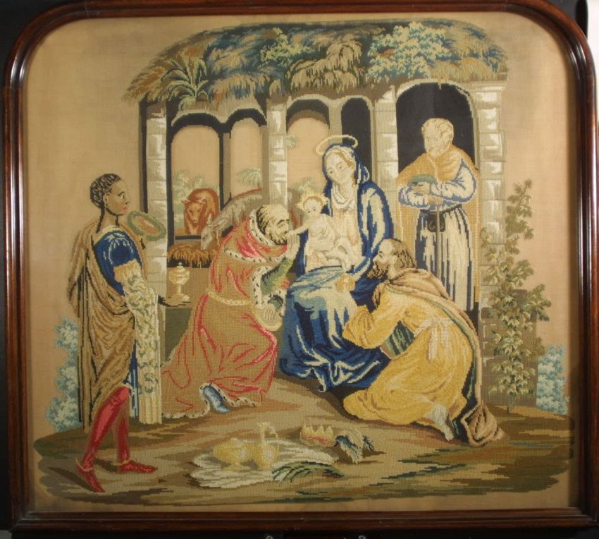 Berlin woolwork and silk picture; depicts nativity; polychromatic; beige background; tent stitch, cross stitch; framed, under glass.