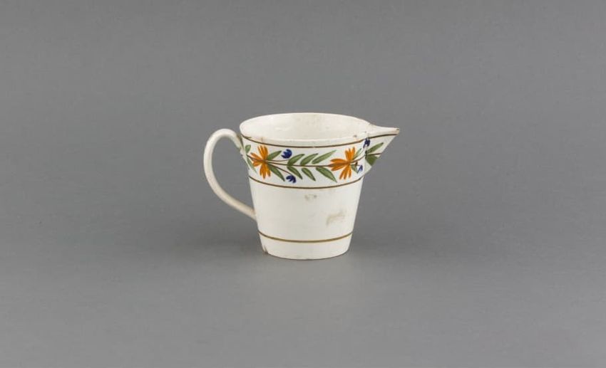 Pearlware handled cream pitcher. Brown bands and a floral chain design.