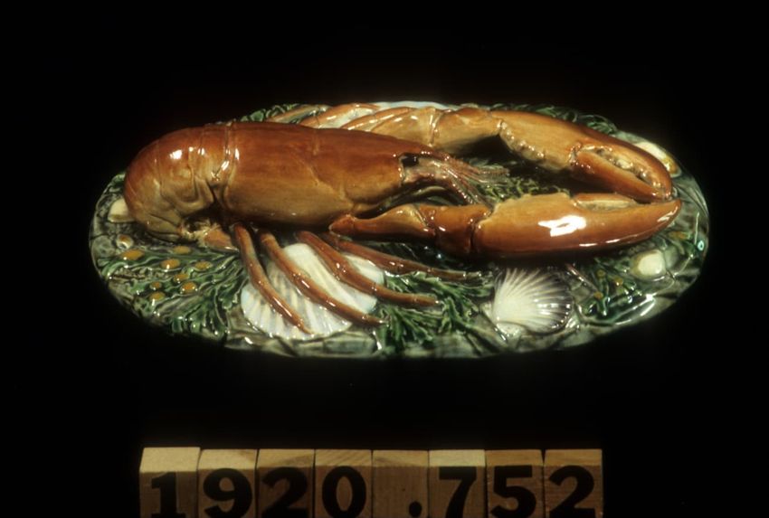 Earthenware serving dish cover with molded decoration of a lobster resting on top of seashells, rocks, and seaweed.