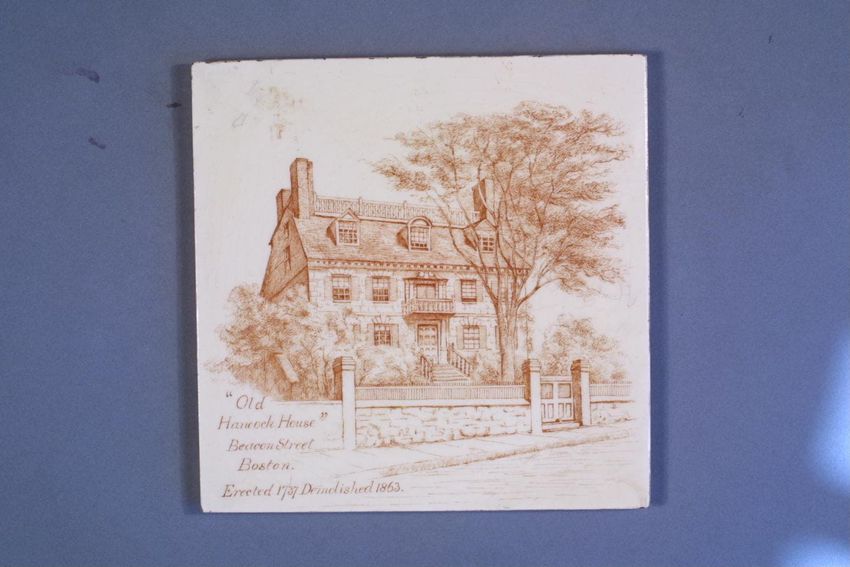 Square, decorative ceramic tile; cream-colored with transfer print of the Hancock House, Boston (front); Maker's notations on back, with clipping from Boston Herald "Sale of the Old Hancock House at Auction - The Ancient Relic is Knocked Down for $230."