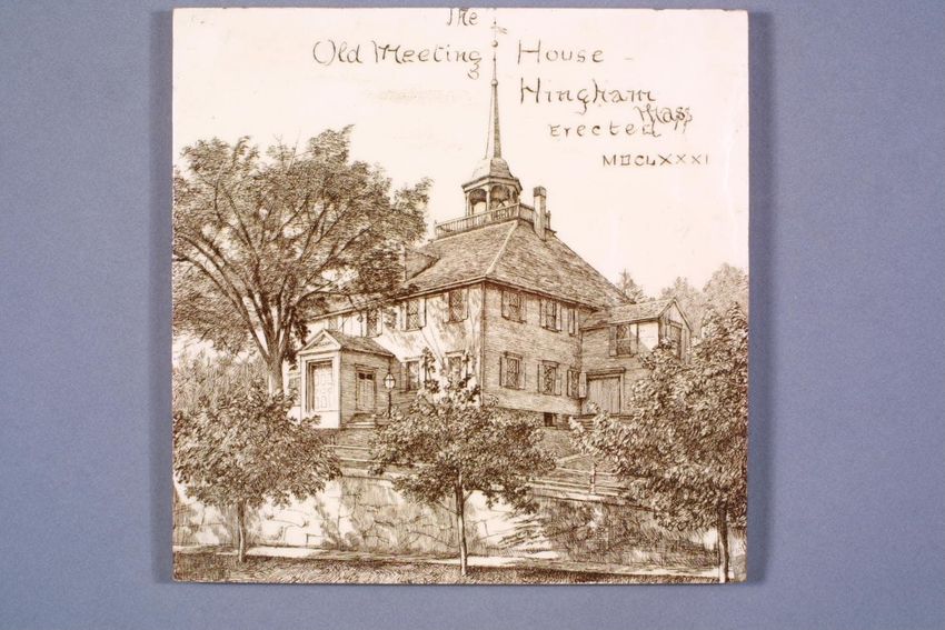 Square, decorative ceramic tile; cream-colored with brown transfer print of Old Meeting House, Hingham, Massachusetts