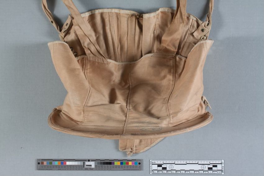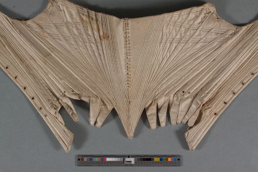 A pair of stays made from fine linen, handsewn and edged with leather on the waist tabs and top. The center front is embellished with decorative cross-lacing in a thin wool tape, the same tape used to cover the seams on each section of the stay body. The body is lined with undyed linen. There is so...