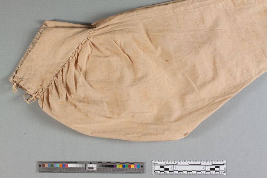 Tan; front closure with three large self-covered buttons, and two smaller with placket; two turned down pockets with white lining; watch pocket hidden in waistband; back is open, with two pairs of eyes and leather laces; four buttons and tab at leg opening; gathered at back.