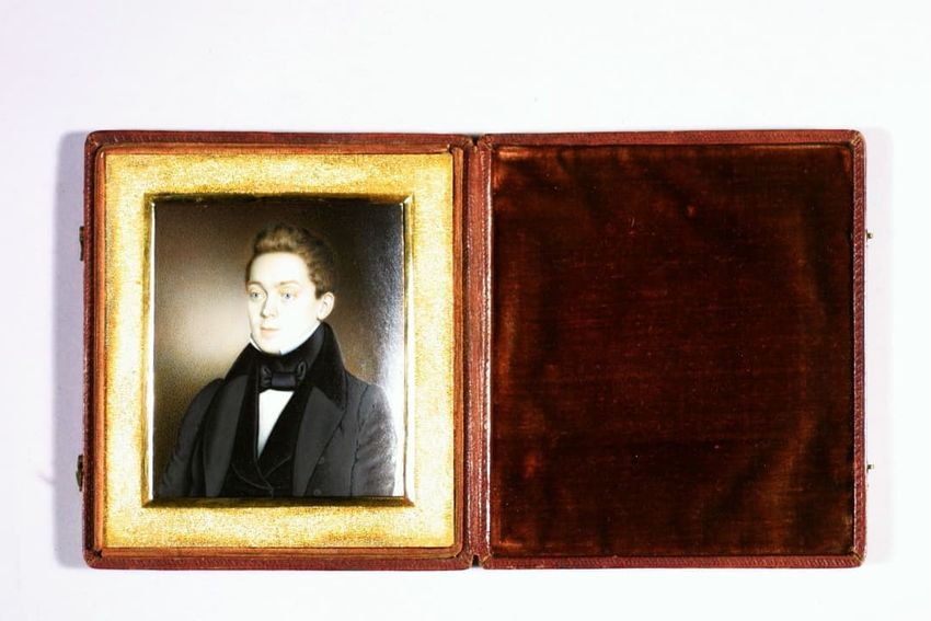 This bust-length miniature portrait depicts a young man in three-quarters profile, facing left, wearing a black waistcoat, coat and tie against a stippled grey/black background. The portrait is in its original plush-lined, red leather case.