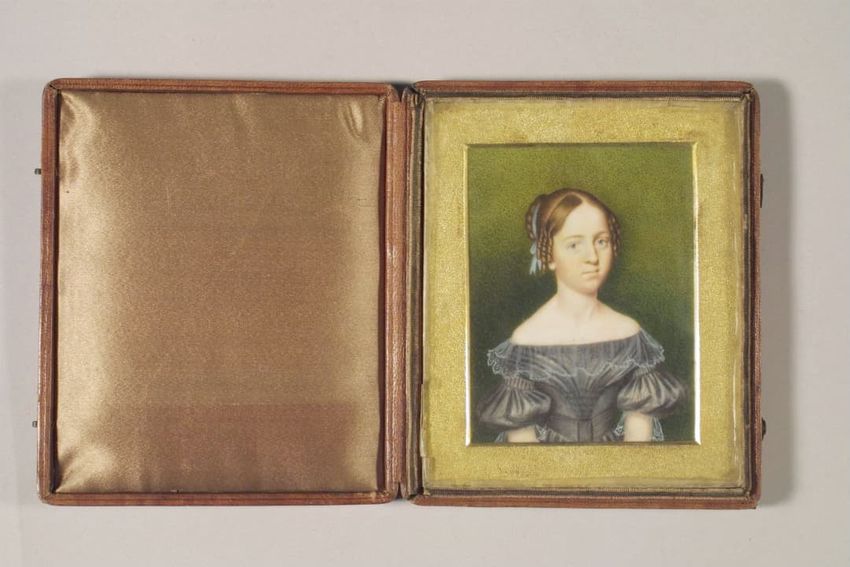 This bust-length portrait of a young woman depicts her in three-quarter profile facing right. She wears a dark grey dress with a neckline cut just off of the shoulders, with a fine lace collar and puffed short sleeves with lace cuffs. Her hair is parted in the middle and dressed in ringlets over her...