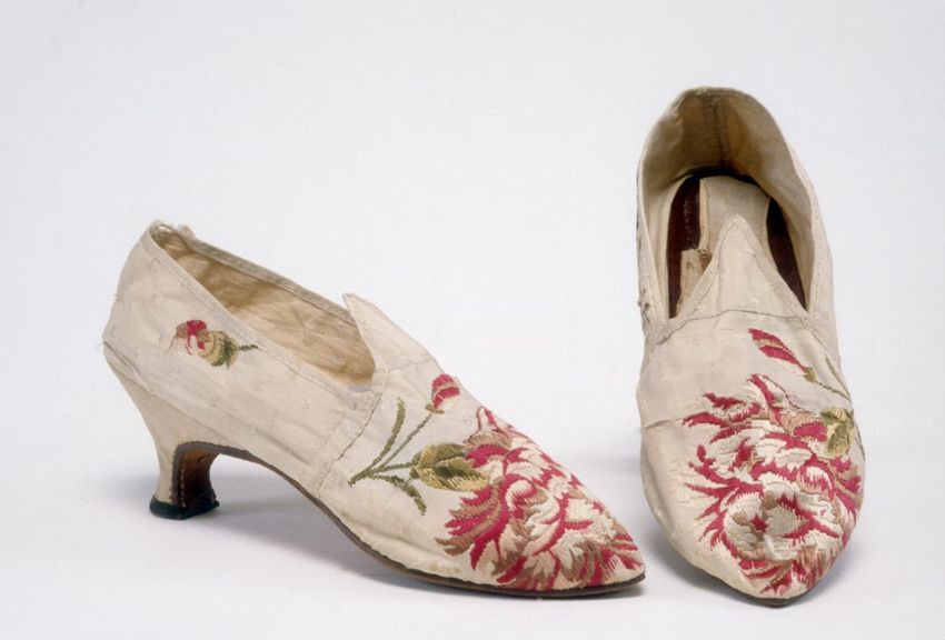 Pair of pale blue silk shoes with a ground of small satin dots. The toe is embroidered with padded rosettes. The heel is thin, 2 3/4 inches high and covered with white silk.