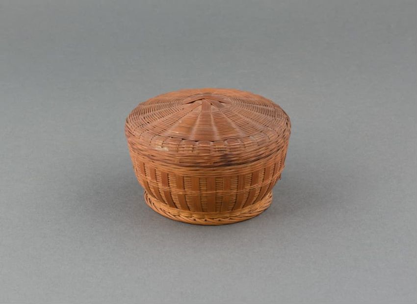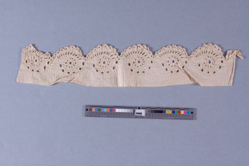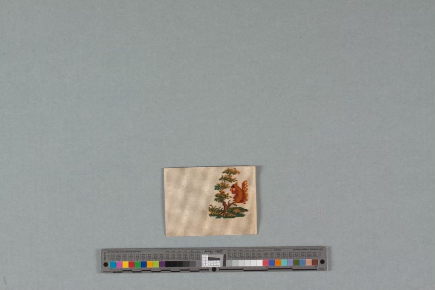 Alphabet/Verse Sampler. Squarish, cream colored linen ground. Strawberry vine border and inner border of potted flowers, berries and birds. Verse at center surrounded by strawberry vine border. Polychromatic.  One Alphabet-complete and in order. Other stitches: eyelet hole